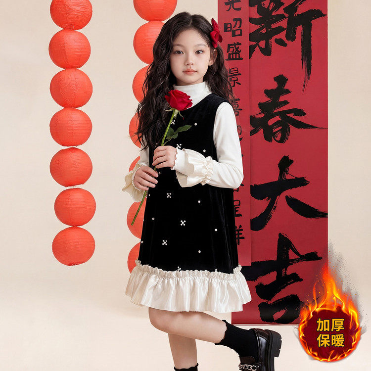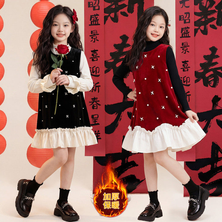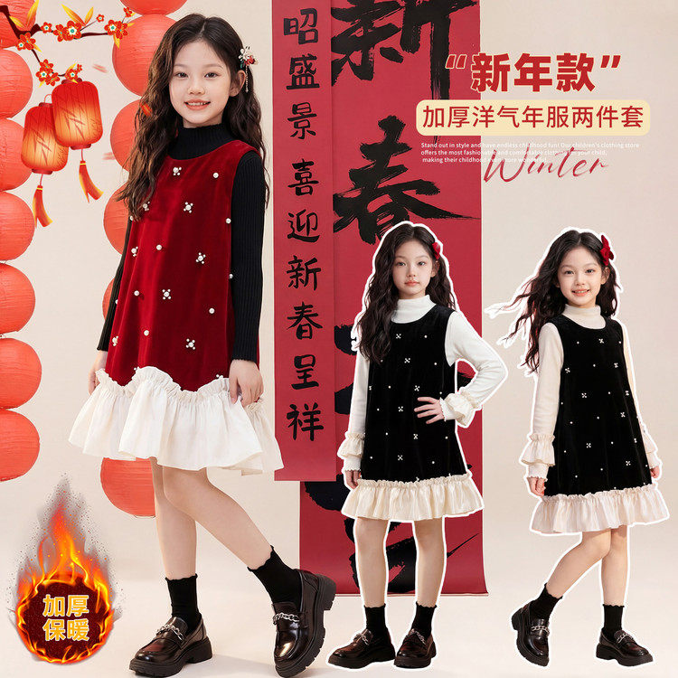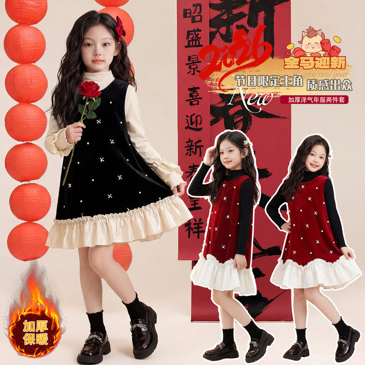 套头圆领女童连衣裙两件套秋冬新款洋气休闲长袖中长裙保暖套装