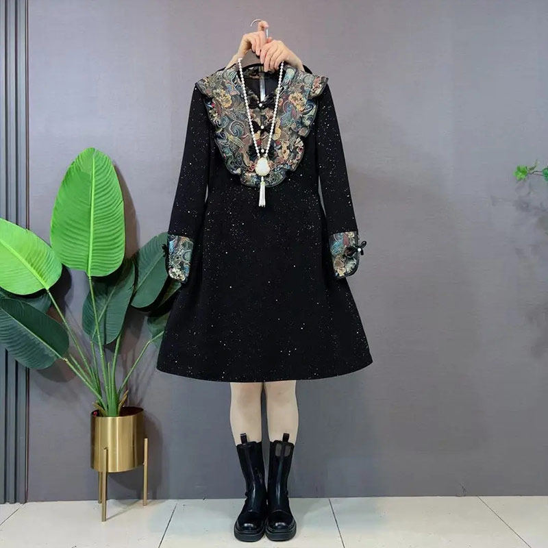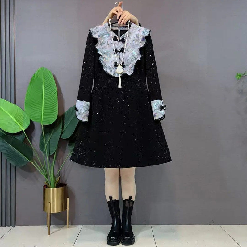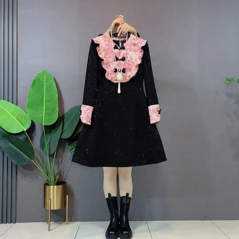 胖妹妹拼色花纹立领盘扣收腰旗袍裙大码女装中长款显瘦冬季连衣裙