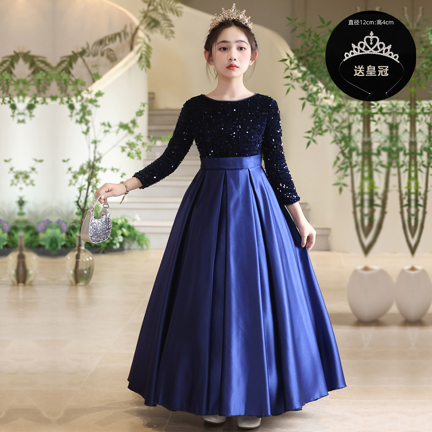 女童长袖亮片连衣裙黑色钢琴演出服主持人表演舞台装合唱团表演服