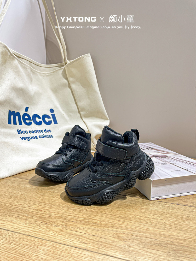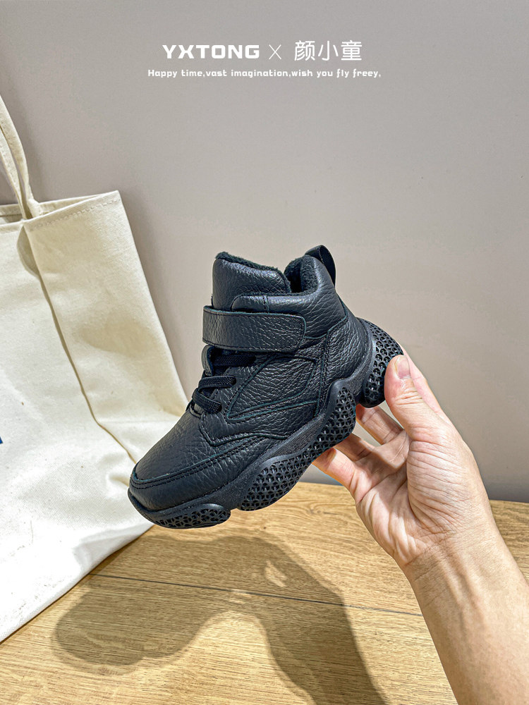 真皮加绒男童保暖运动鞋2025年秋冬女童棉鞋宝宝魔术贴黑色老爹鞋