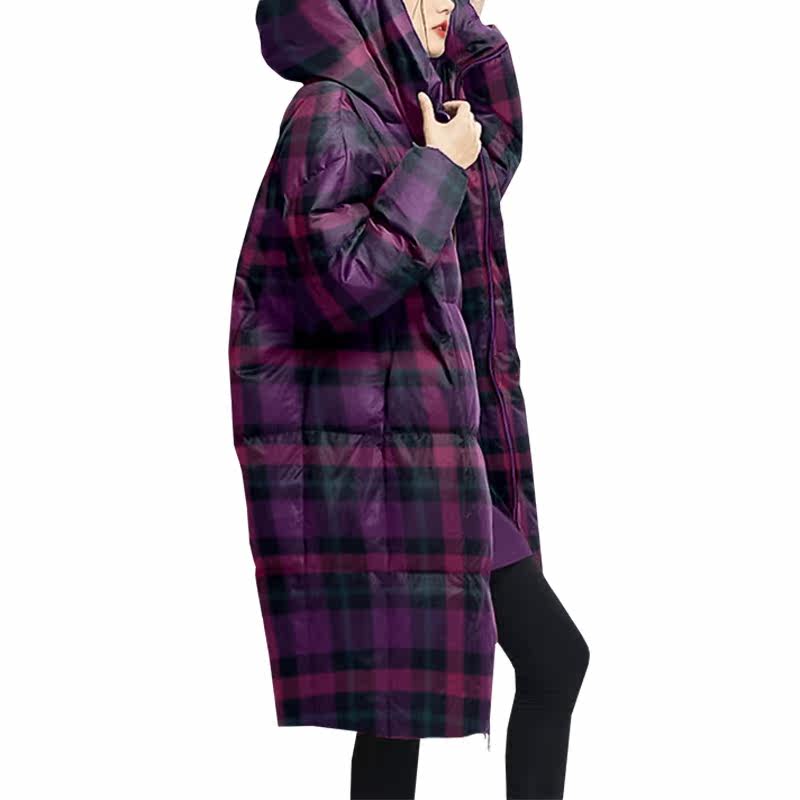 时尚洋气紫色格子连帽羽绒服女装中长款2026年新款冬季加厚外套潮