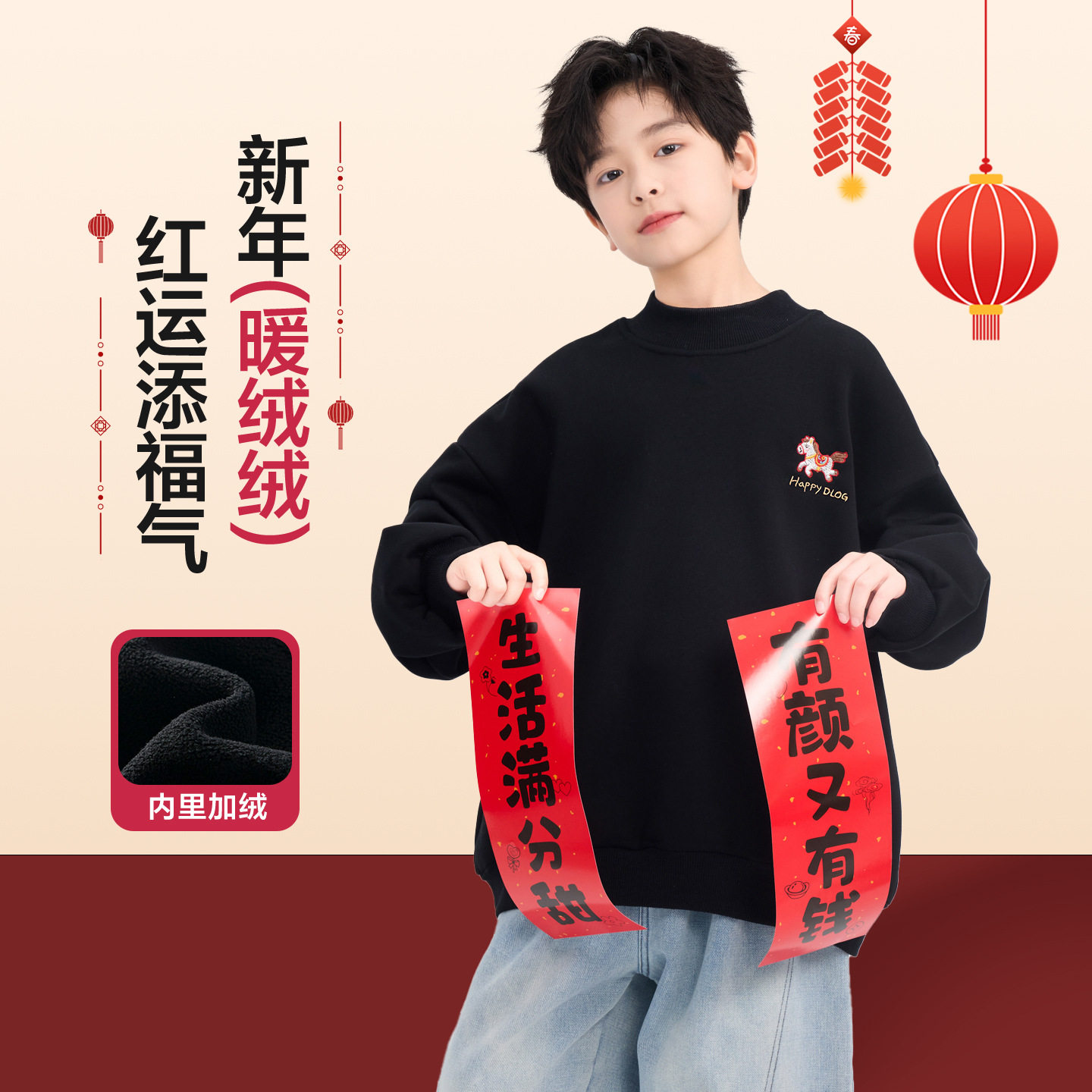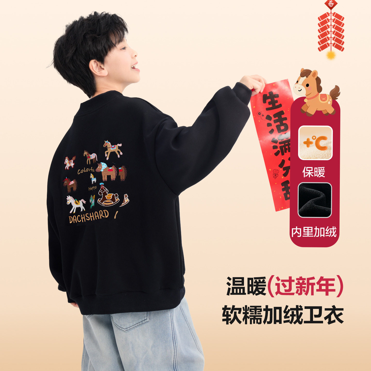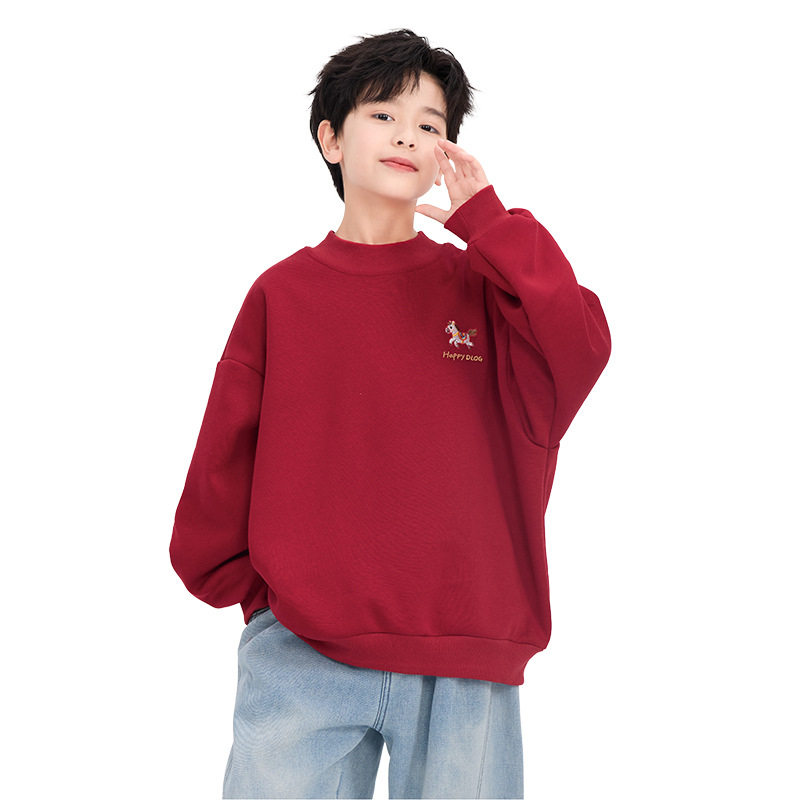 男童冬季马年红色加绒半高领卫衣2025新款青少年儿童新年加厚上衣