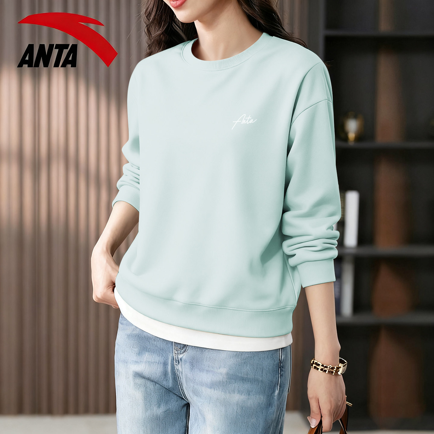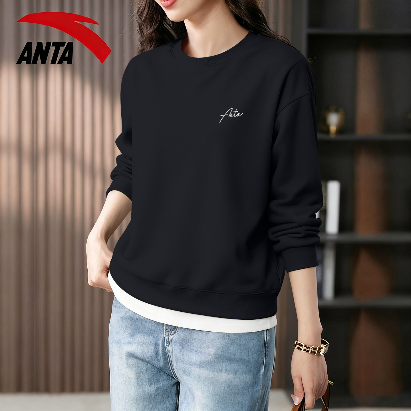 安踏卫衣女2026春季新款宽松紫色圆领套头长袖时尚百搭休闲运动服