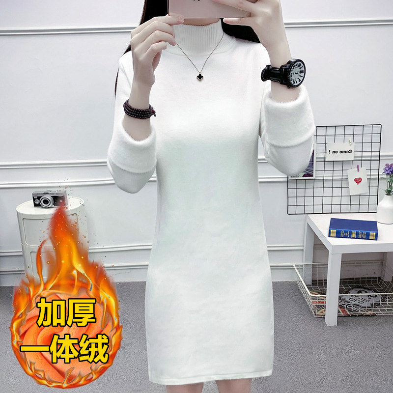 秋冬加厚保暖一体绒打底毛衣女半高领长袖加绒中长款针织衫连衣裙