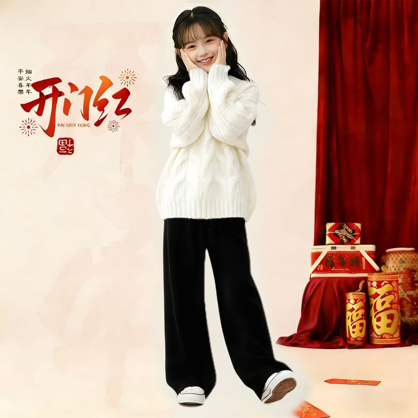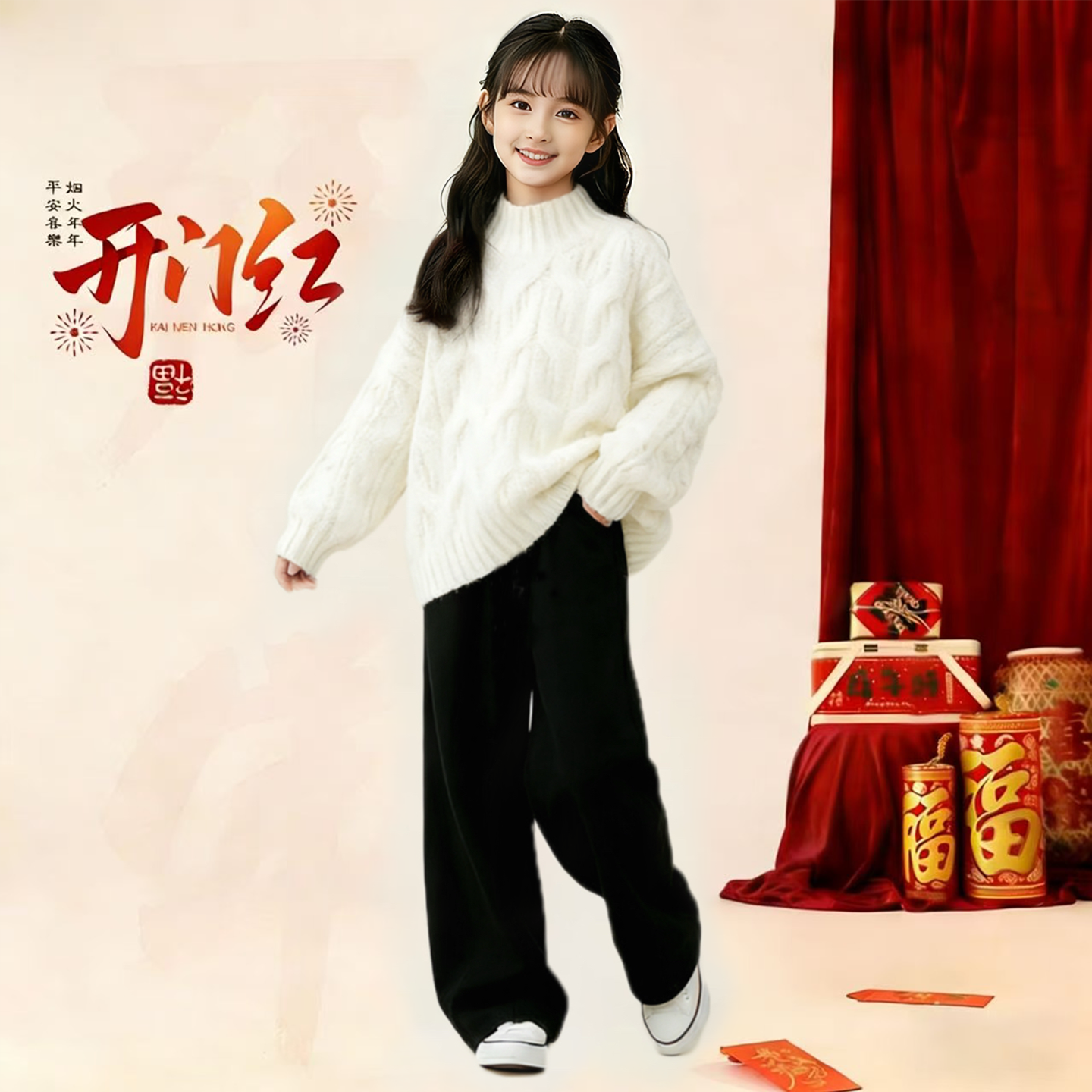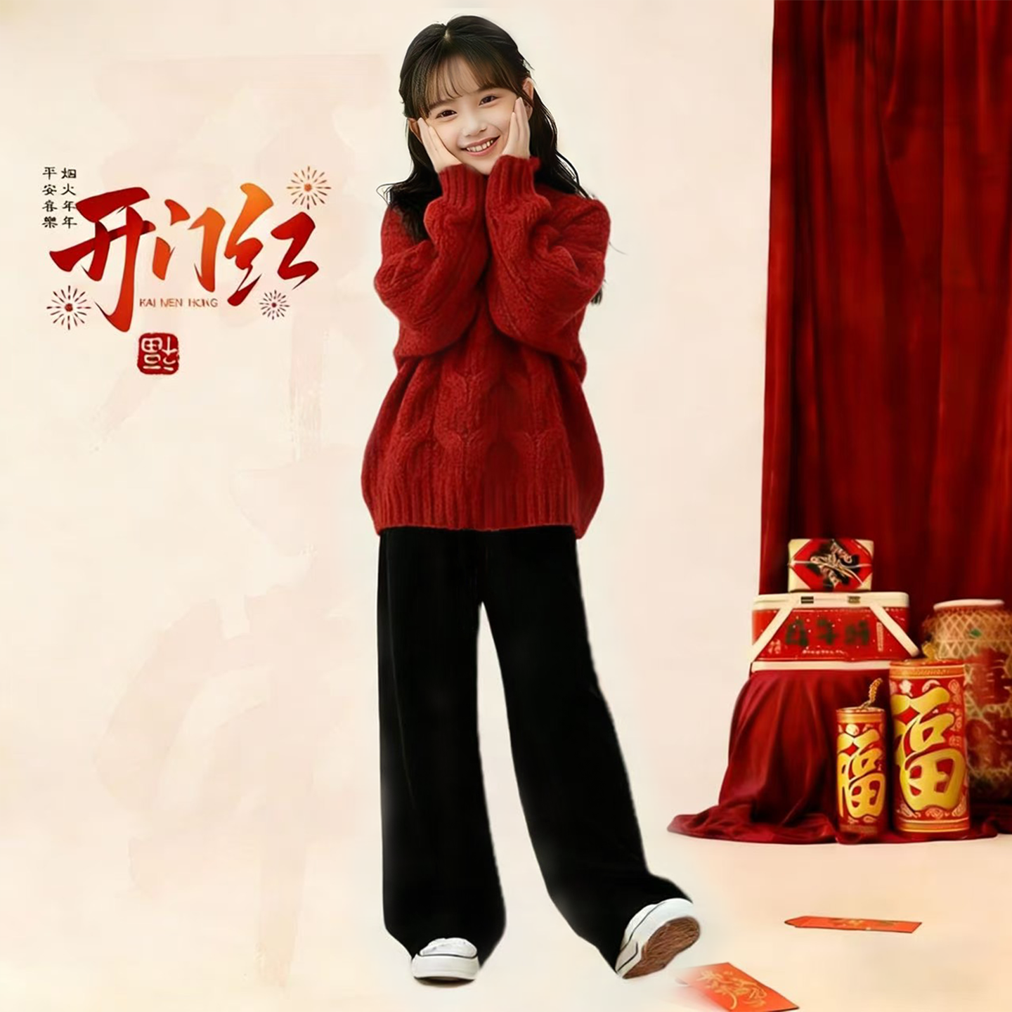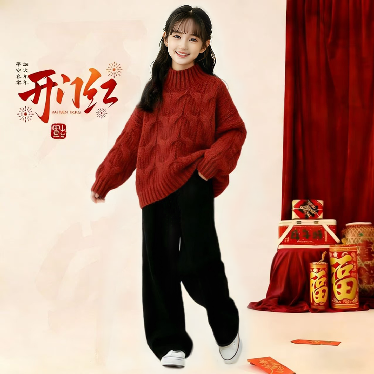 女童秋冬装过年衣服针织红色毛衣2026女孩冬季大童初中生套装裤子