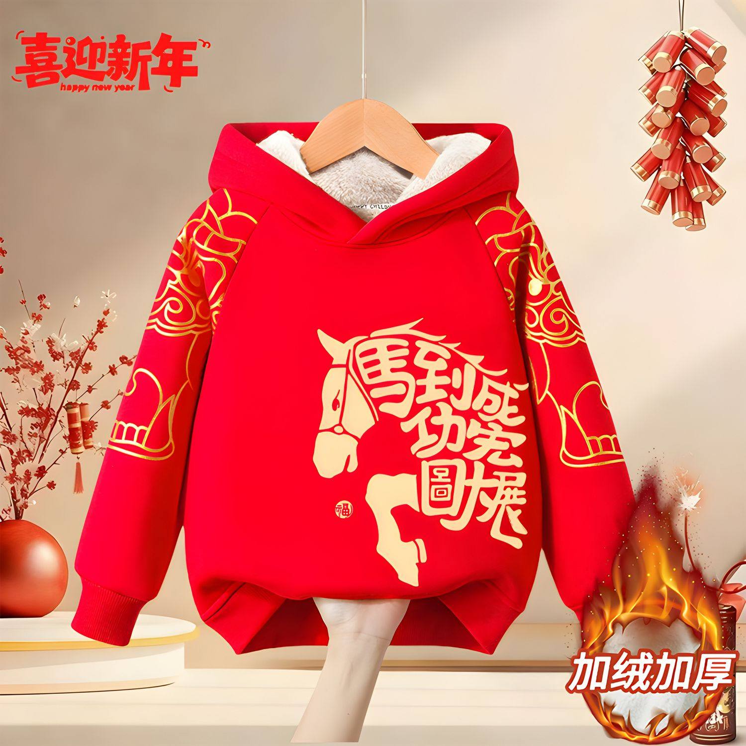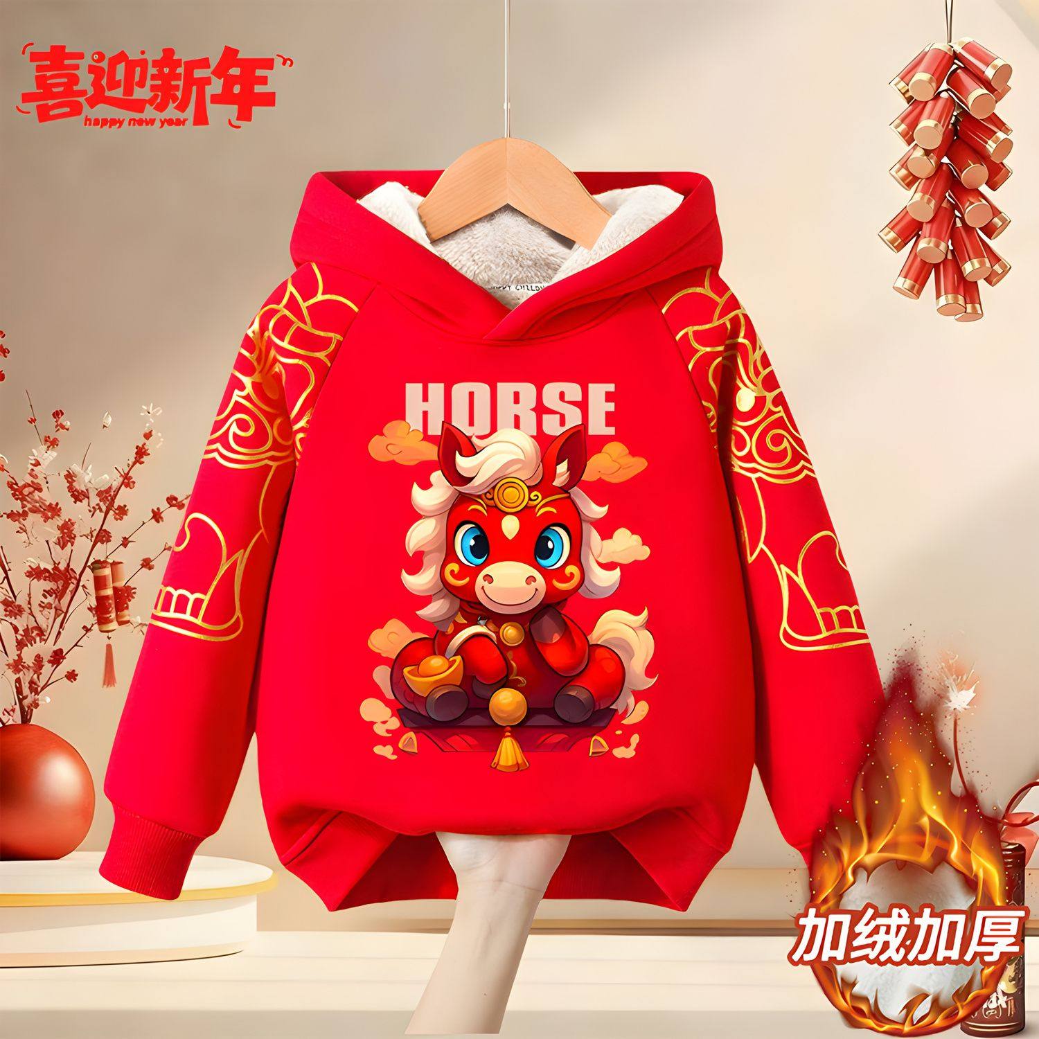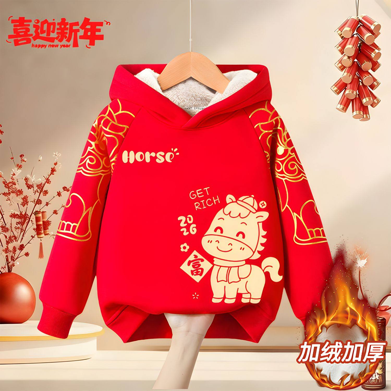 男童红色卫衣加绒2026马年本命年衣服儿童过年连帽上衣女童拜年服