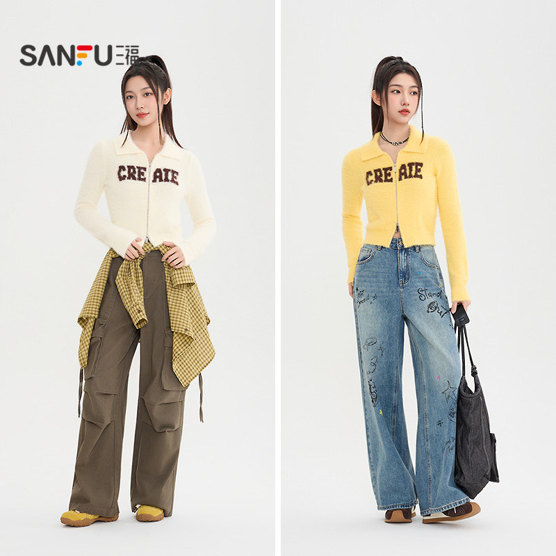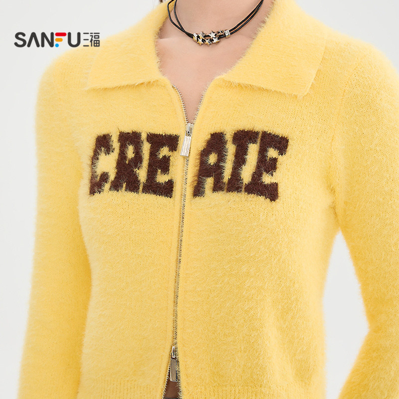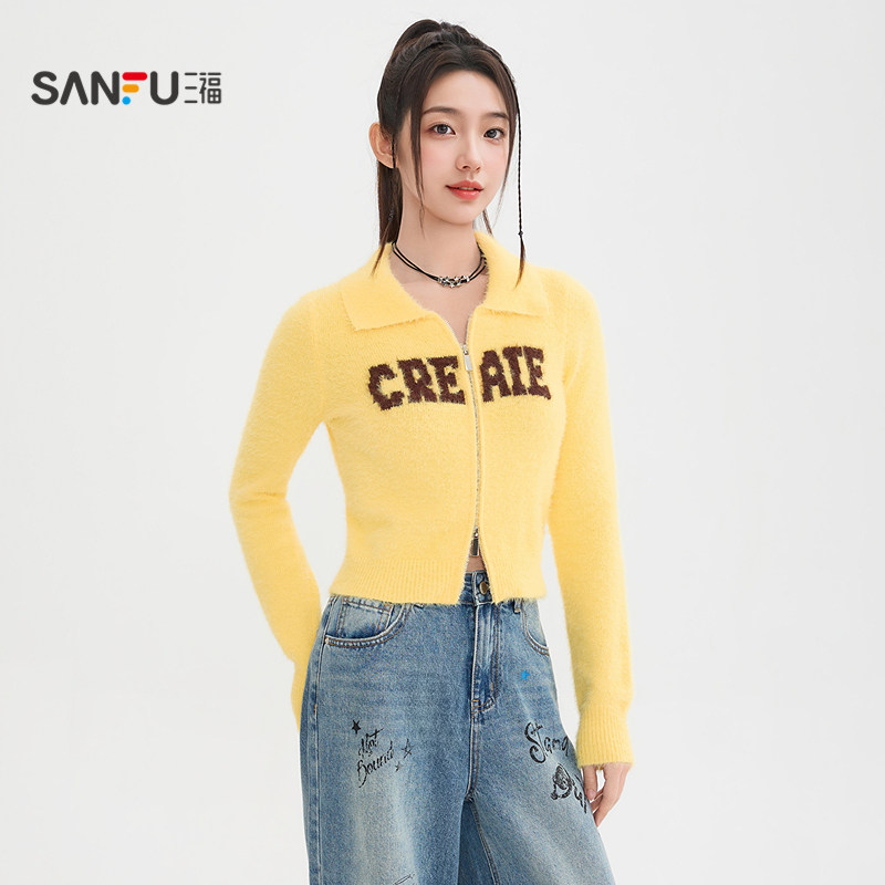 三福毛衣女2026新款春季撞色英文仿貂毛开衫小个子上衣女装515525