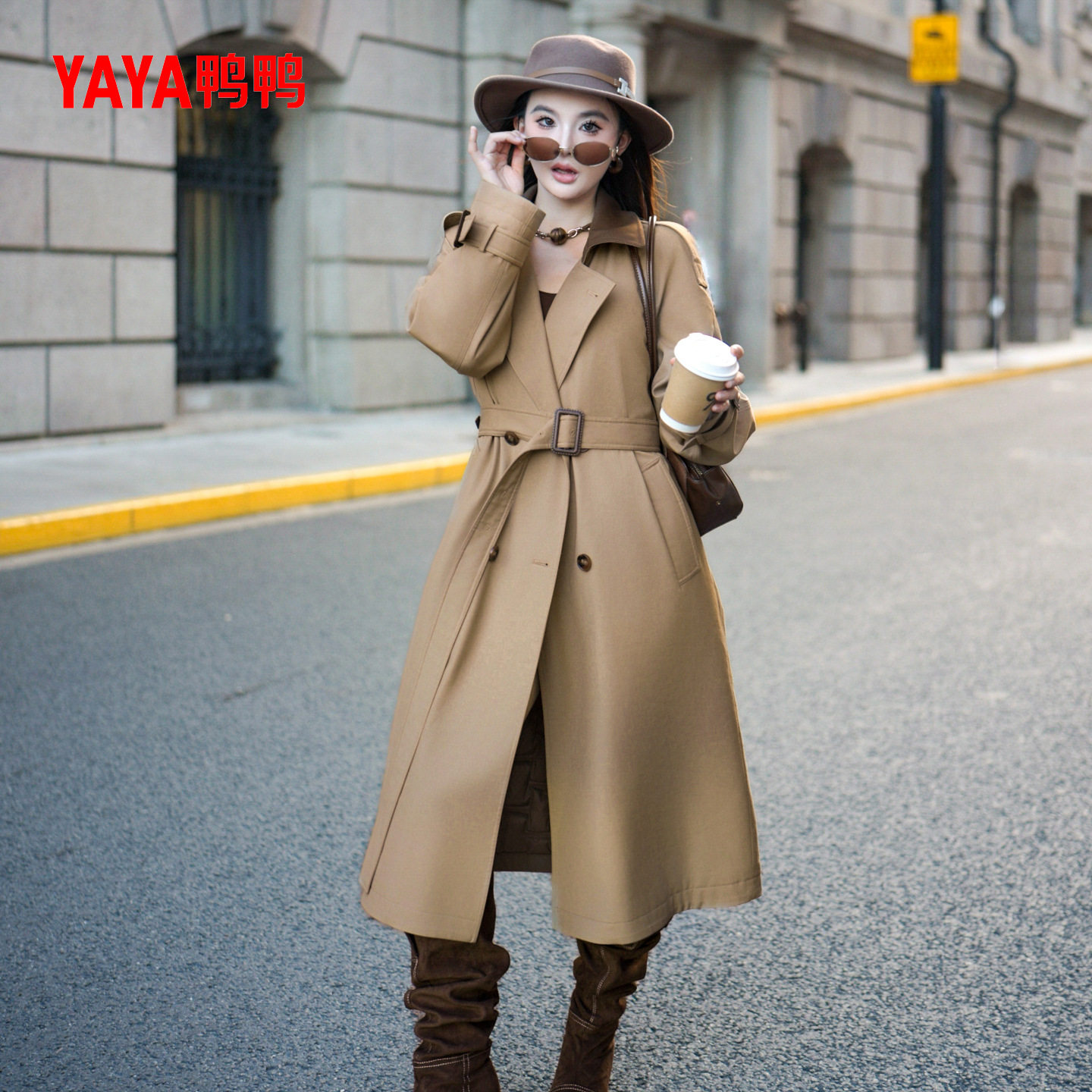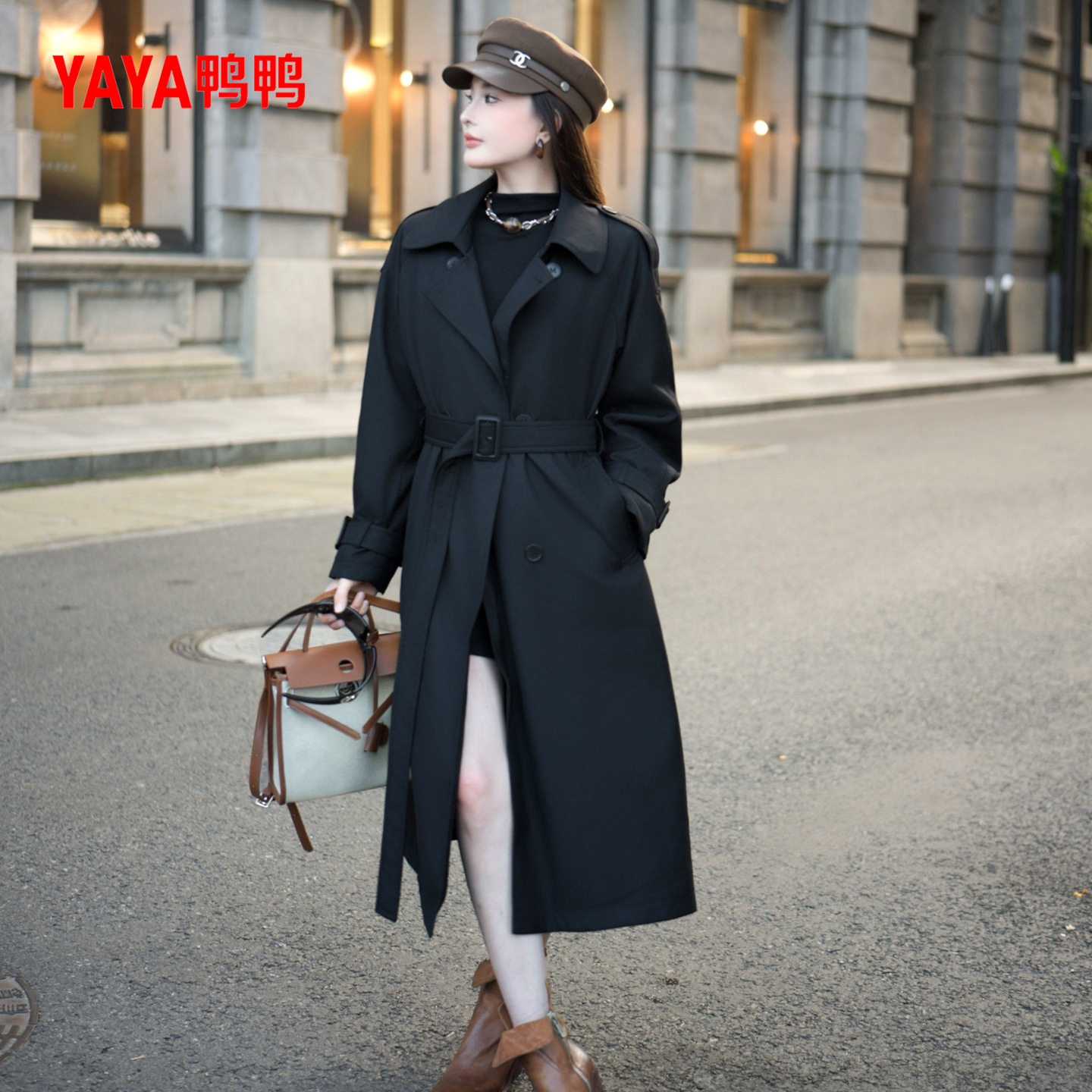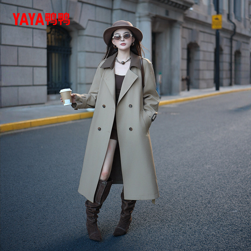 鸭鸭羽绒服2025年冬装新款女士风衣中长款收腰修身翻领休闲外套