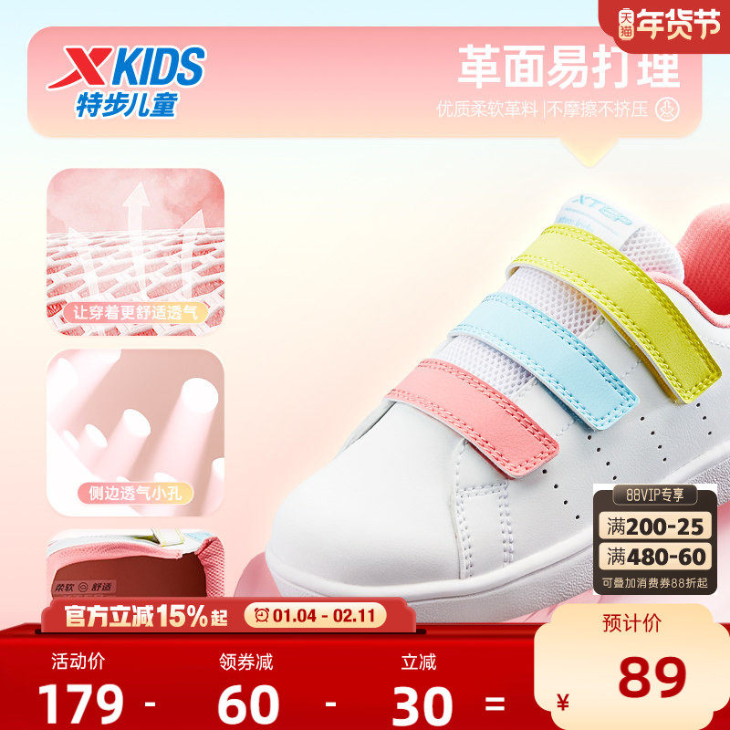 特步童鞋冬季新款儿童运动魔术贴板鞋女童革面休闲鞋小童软底鞋子