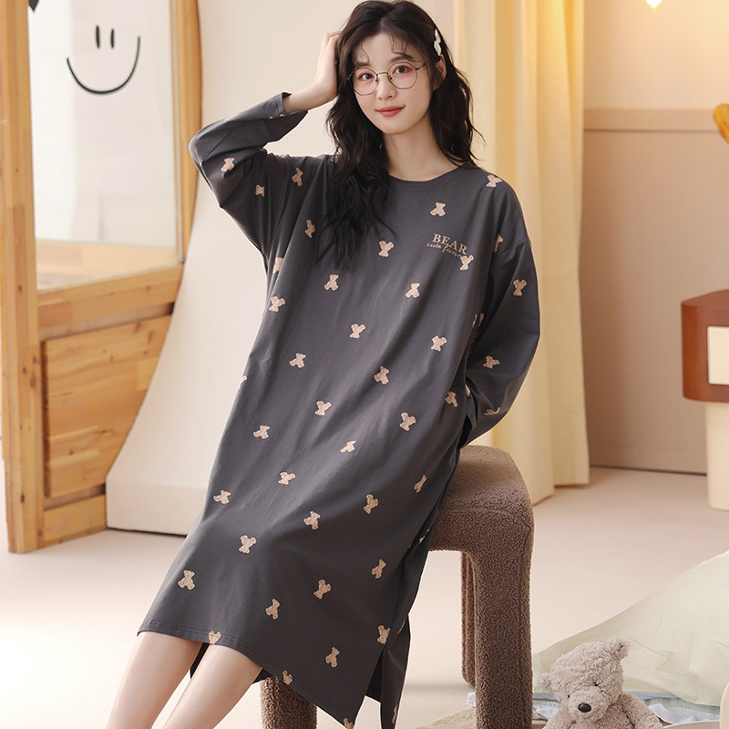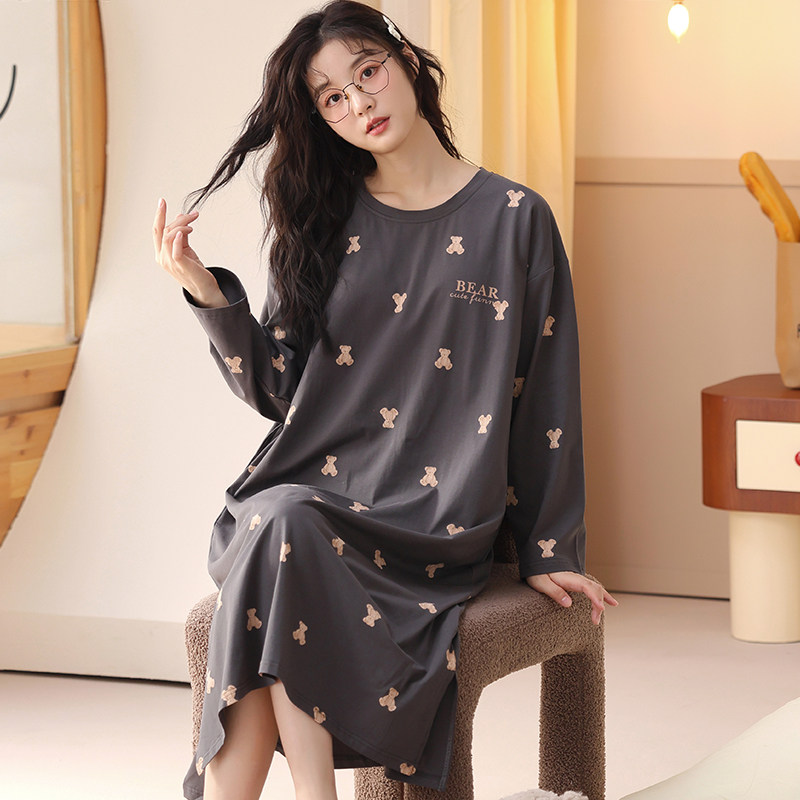 卡之恋纯棉睡裙春秋季长袖睡衣带胸垫中长款连衣裙小熊学生家居服
