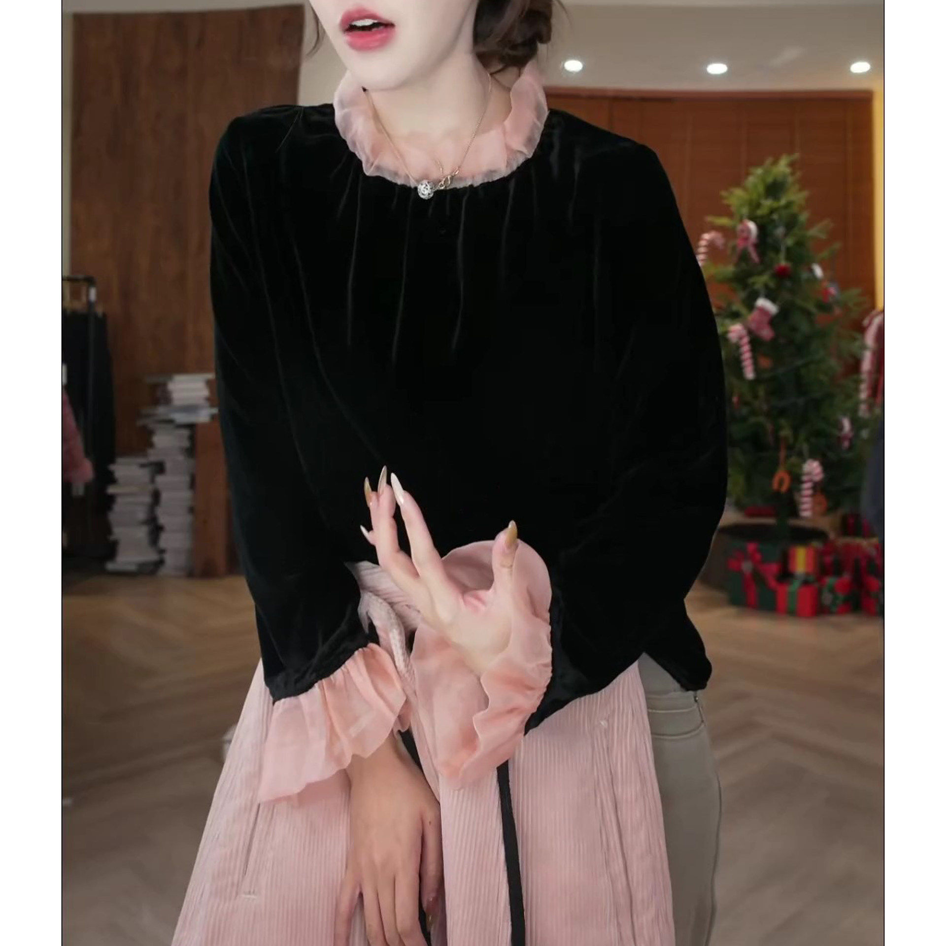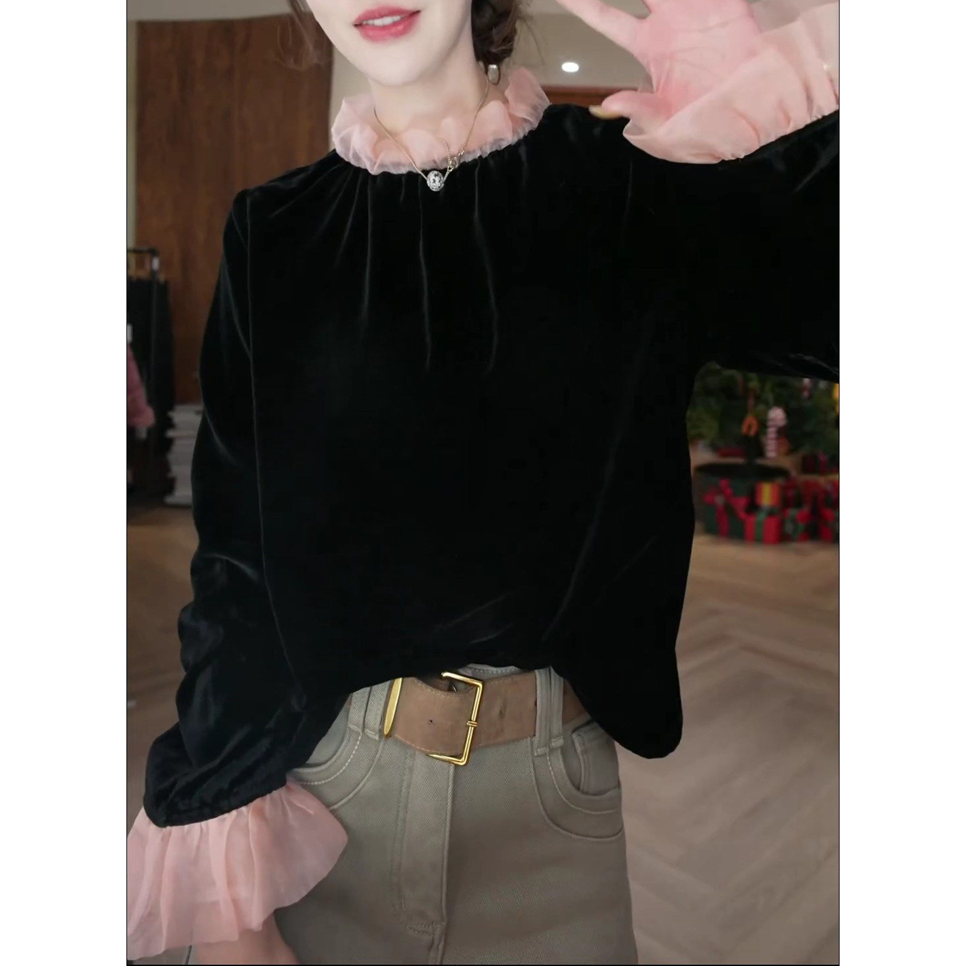 2026早春新款时尚百搭显瘦T恤上衣洋气休闲拼接设计喇叭袖小衫潮