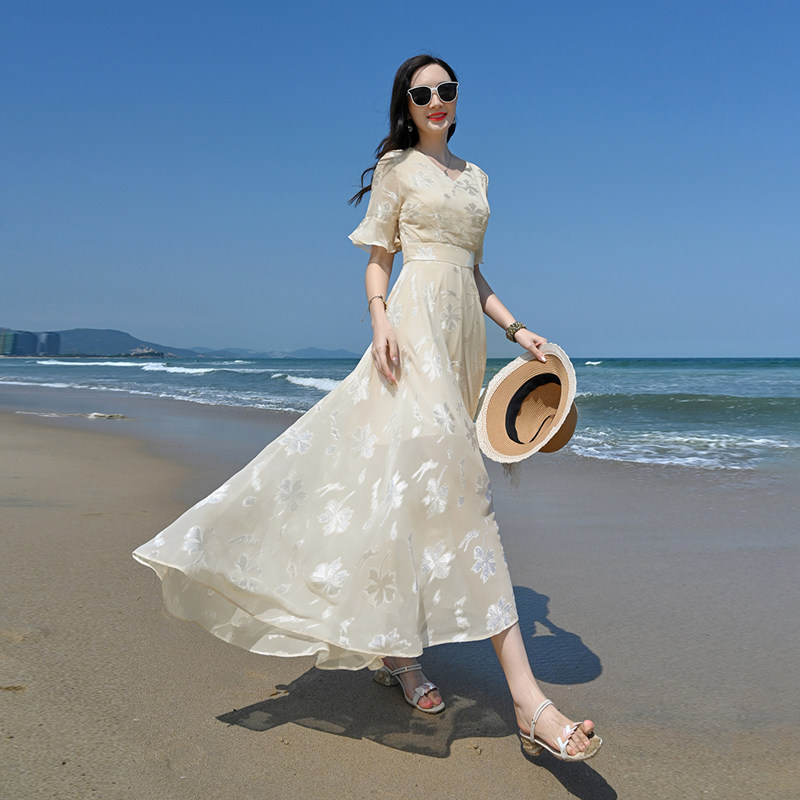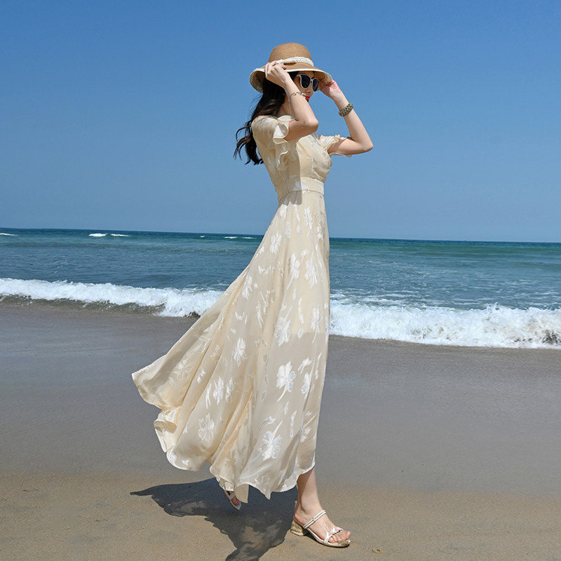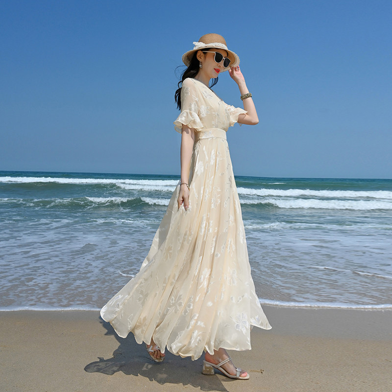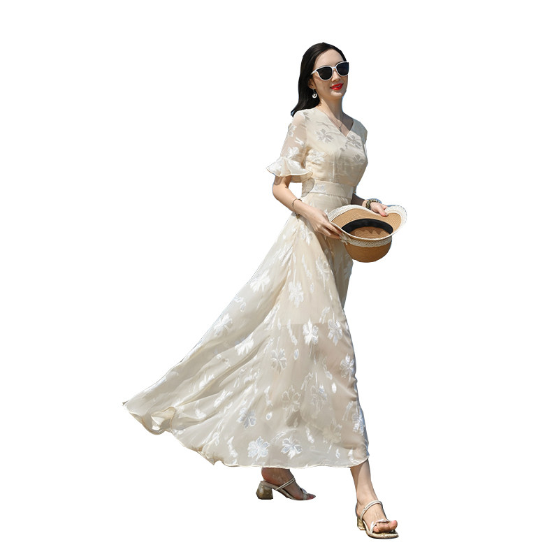 2022年新款夏季白色雪纺碎花连衣裙女长款到脚踝收腰显瘦超长裙子
