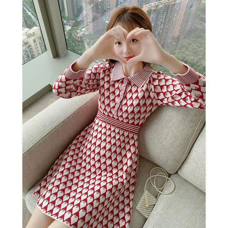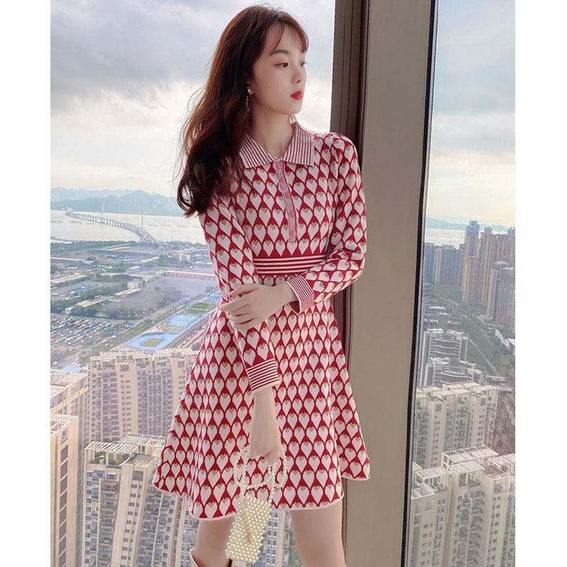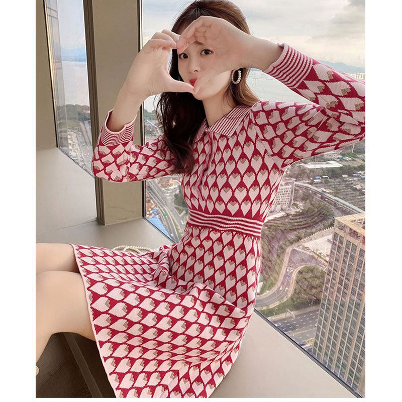 粉色polo领针织连衣裙女2024秋冬新款长袖洋气减龄收腰显瘦打底裙