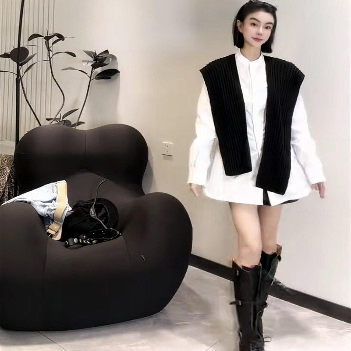 欧货气质收腰白色中长款长袖衬衫连衣裙针织披肩两件套显瘦百搭潮