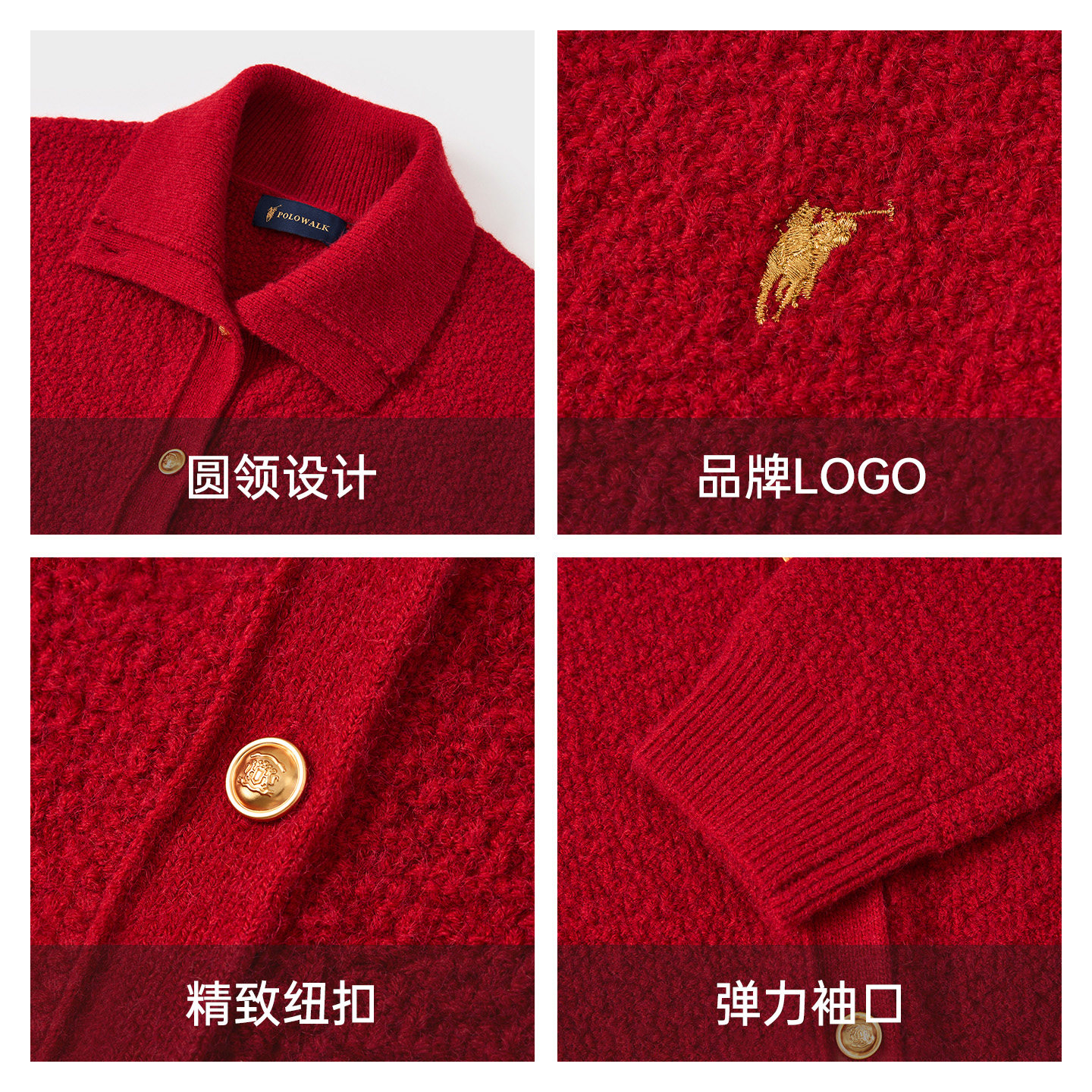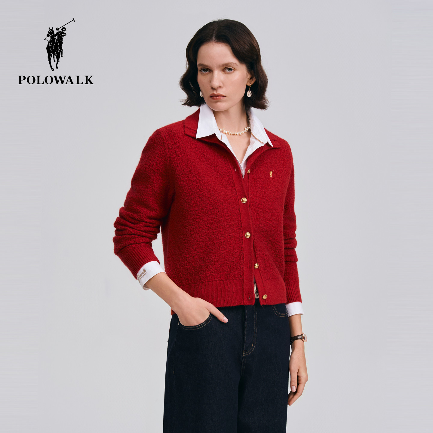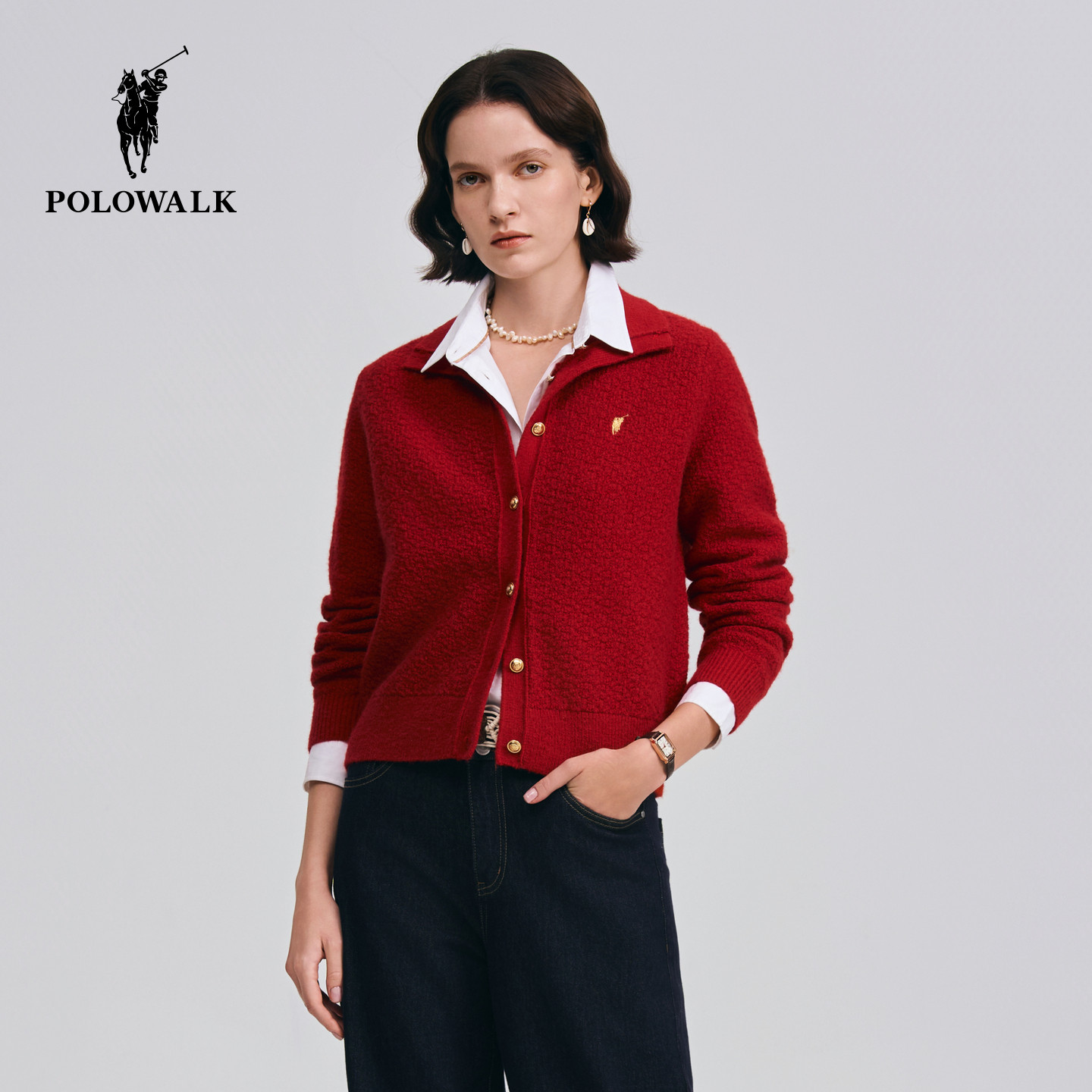 POLOWALK女装针织衫2026春季新款女士翻领针织衫开衫上衣红色毛衣