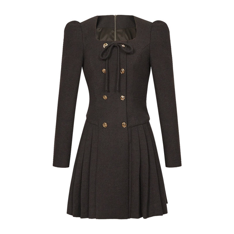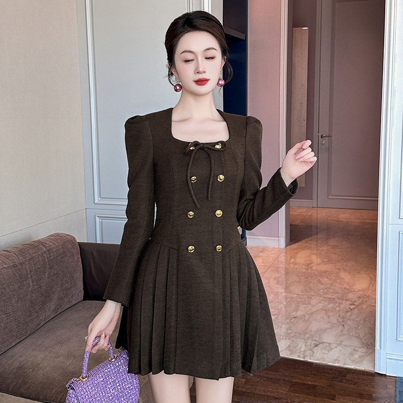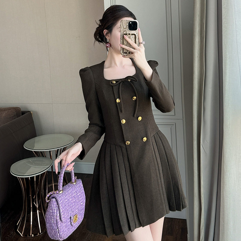 2026春秋新款法式百搭方领收腰连衣裙女士气质a字裙高收腰双排扣
