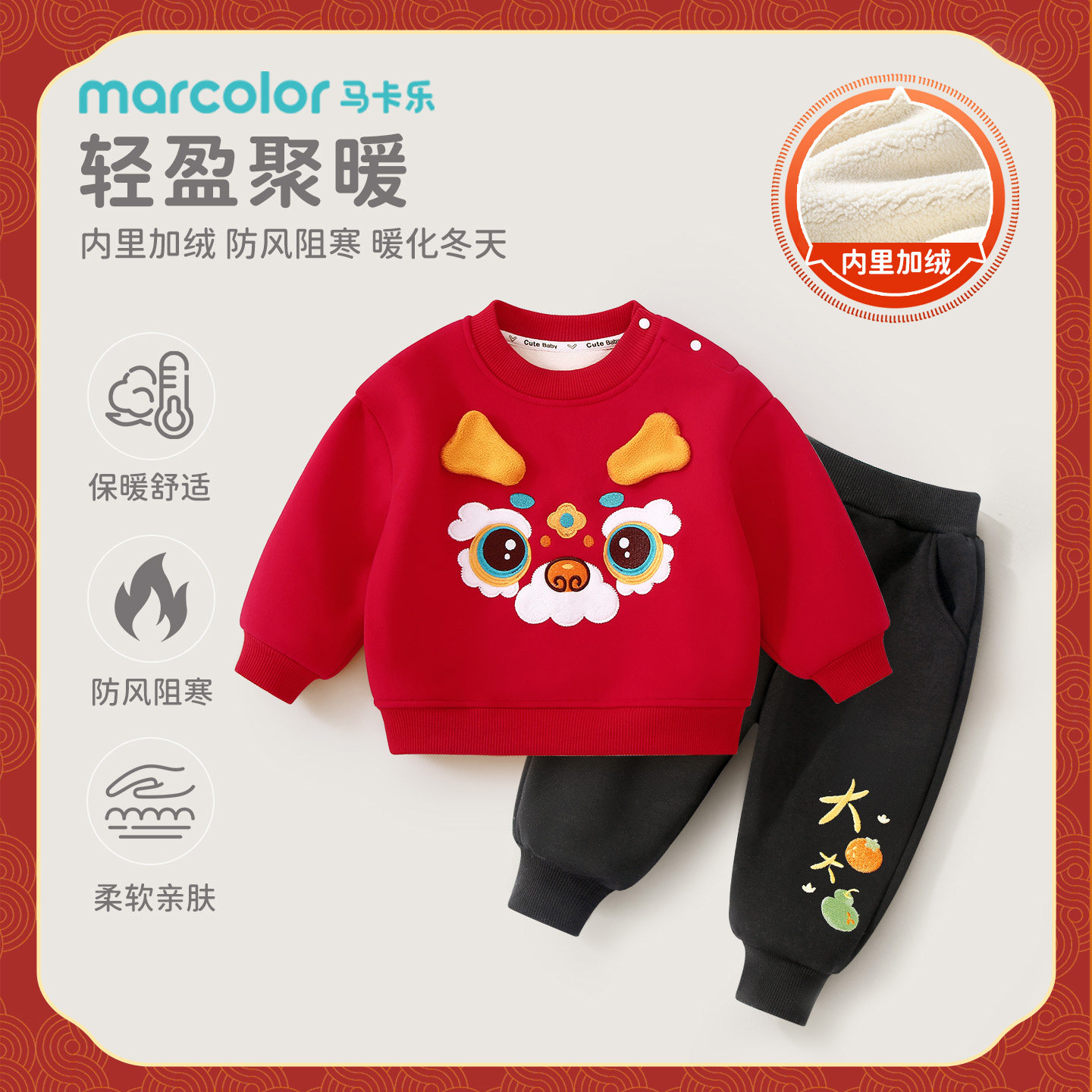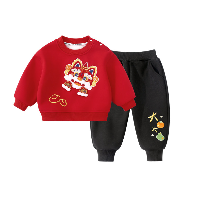 红色婴儿卫衣套装加绒保暖冬季过年服男女宝宝儿童加厚新年两件套