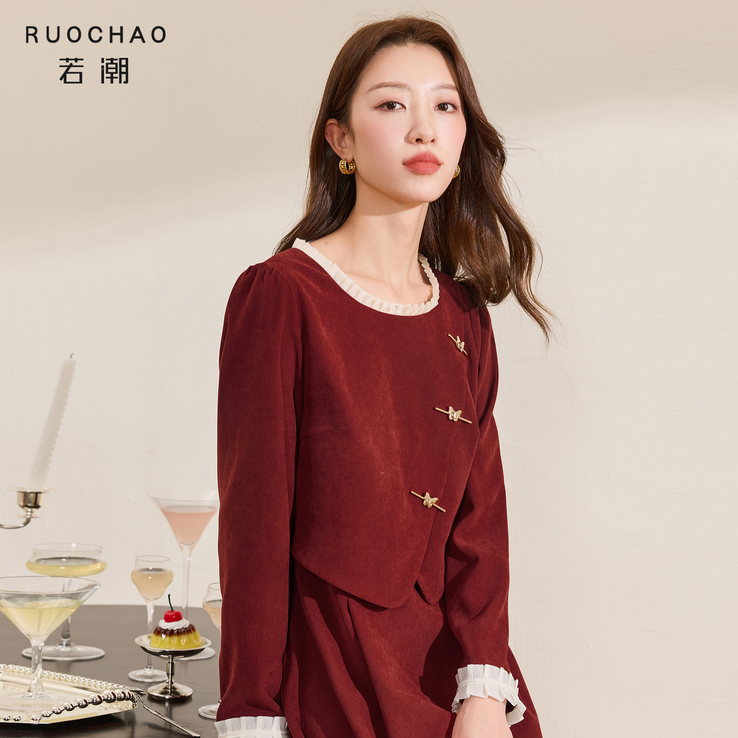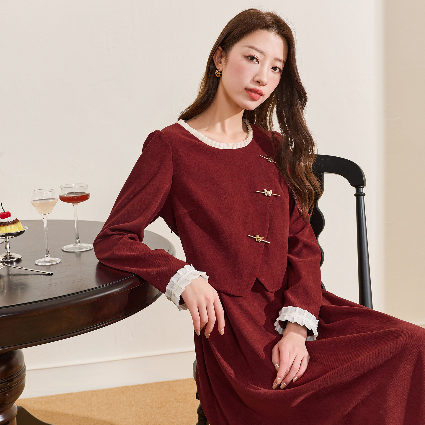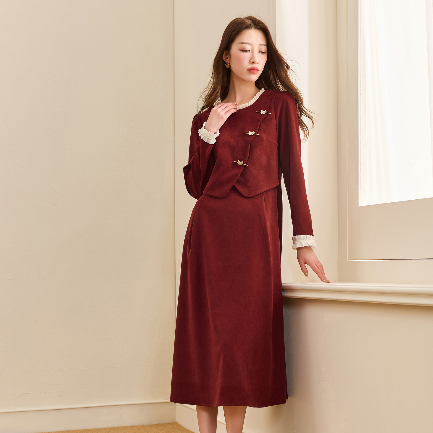 若潮大码女装2025冬季新款花边圆领连衣裙A字长裙蝴蝶胖MM