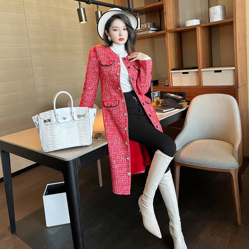 2026秋季新款毛呢小香风显瘦女红色连衣裙修身包臀风衣外套小个子