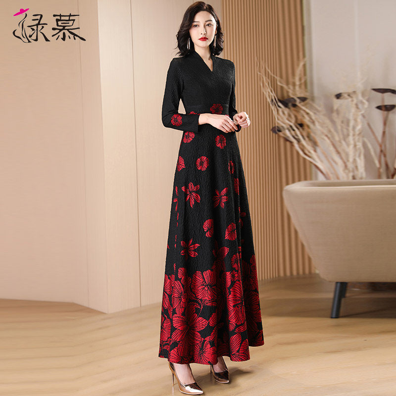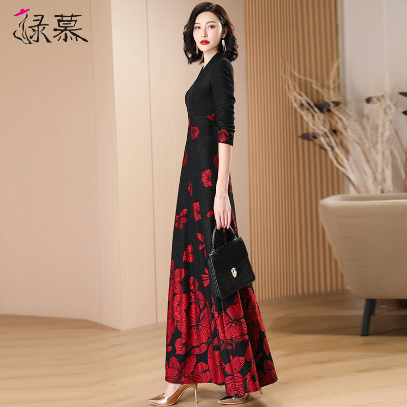 时尚黑色提花长袖连衣裙女长款2025春春秋收腰气质显瘦到脚踝长裙