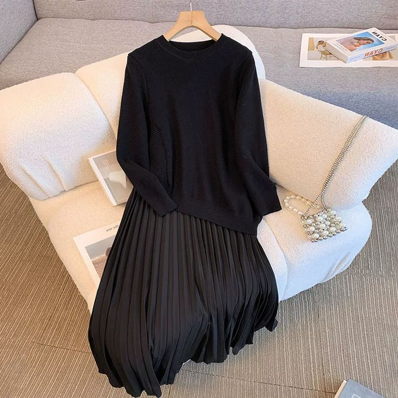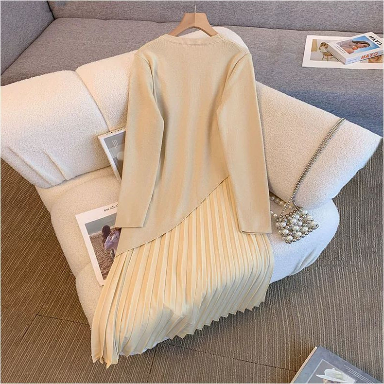秋冬季法式温柔风女胖MM300斤特大码不规则拼接百褶裙长款连衣裙