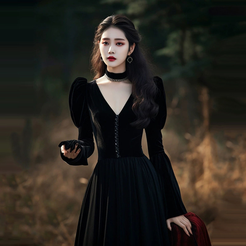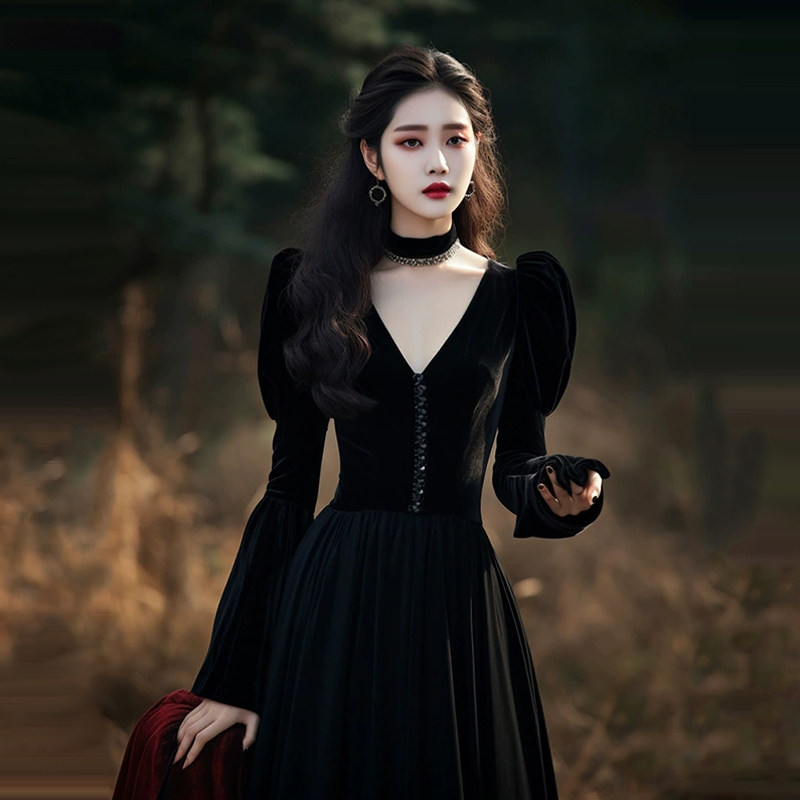 赫本风黑色丝绒V领连衣裙女高级感气质收腰显瘦晚宴聚会礼服长裙