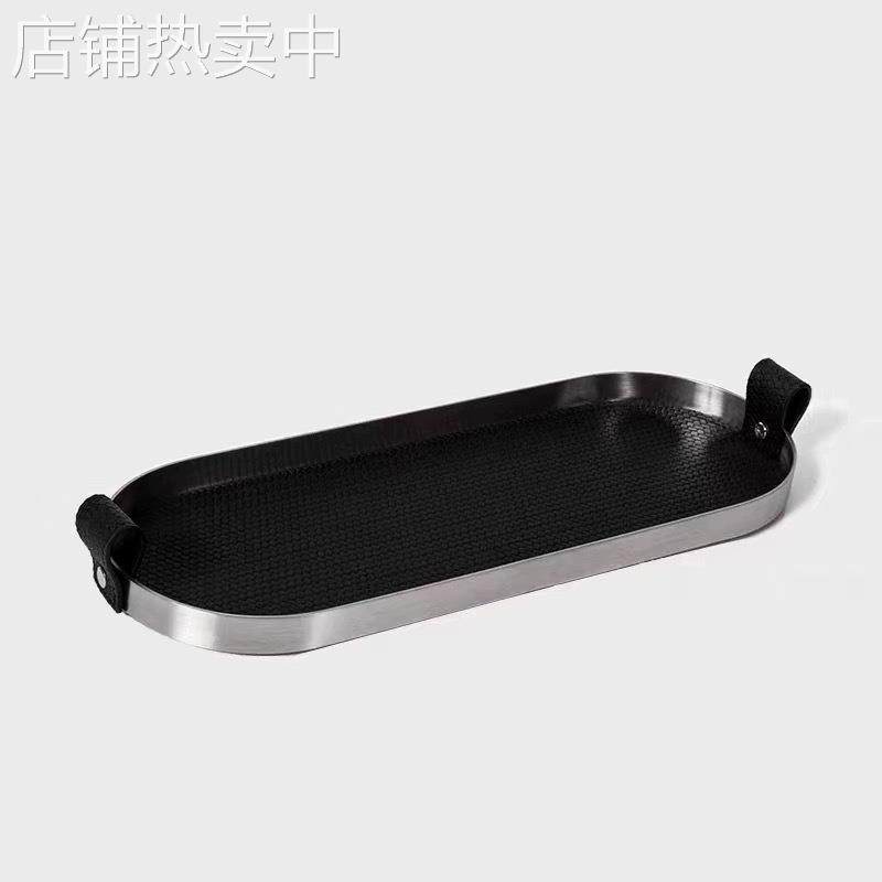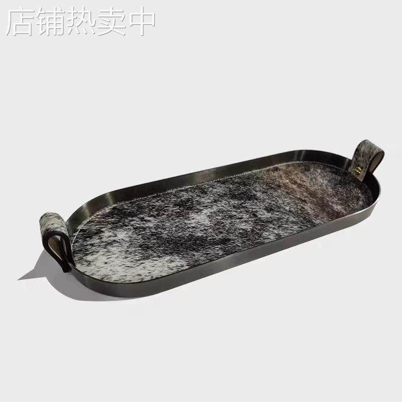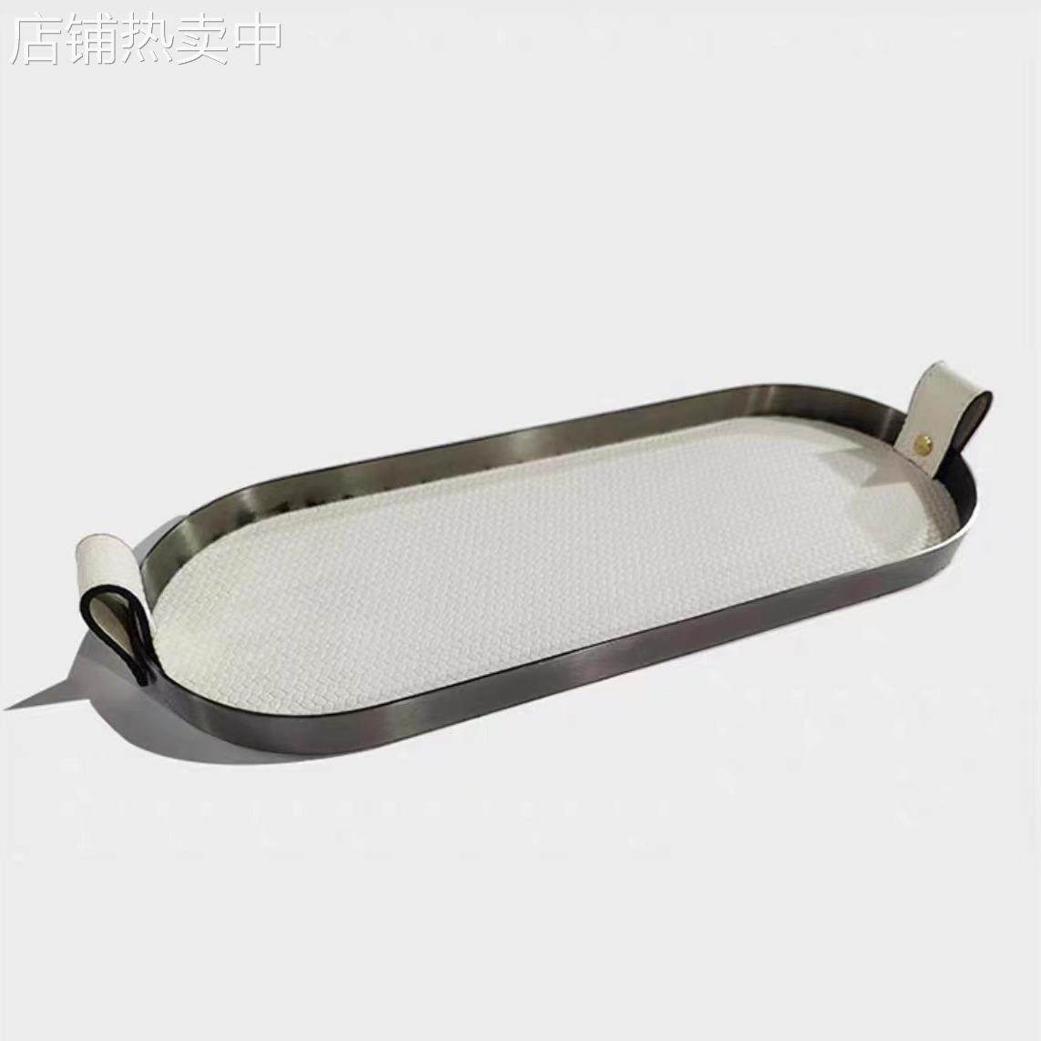 现代简约编织皮革金属马毛椭圆托盘收纳创意摆件桌面茶几样板间