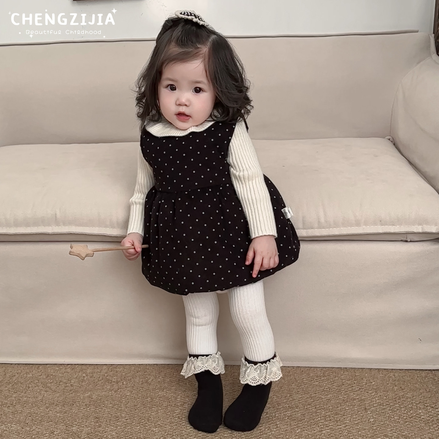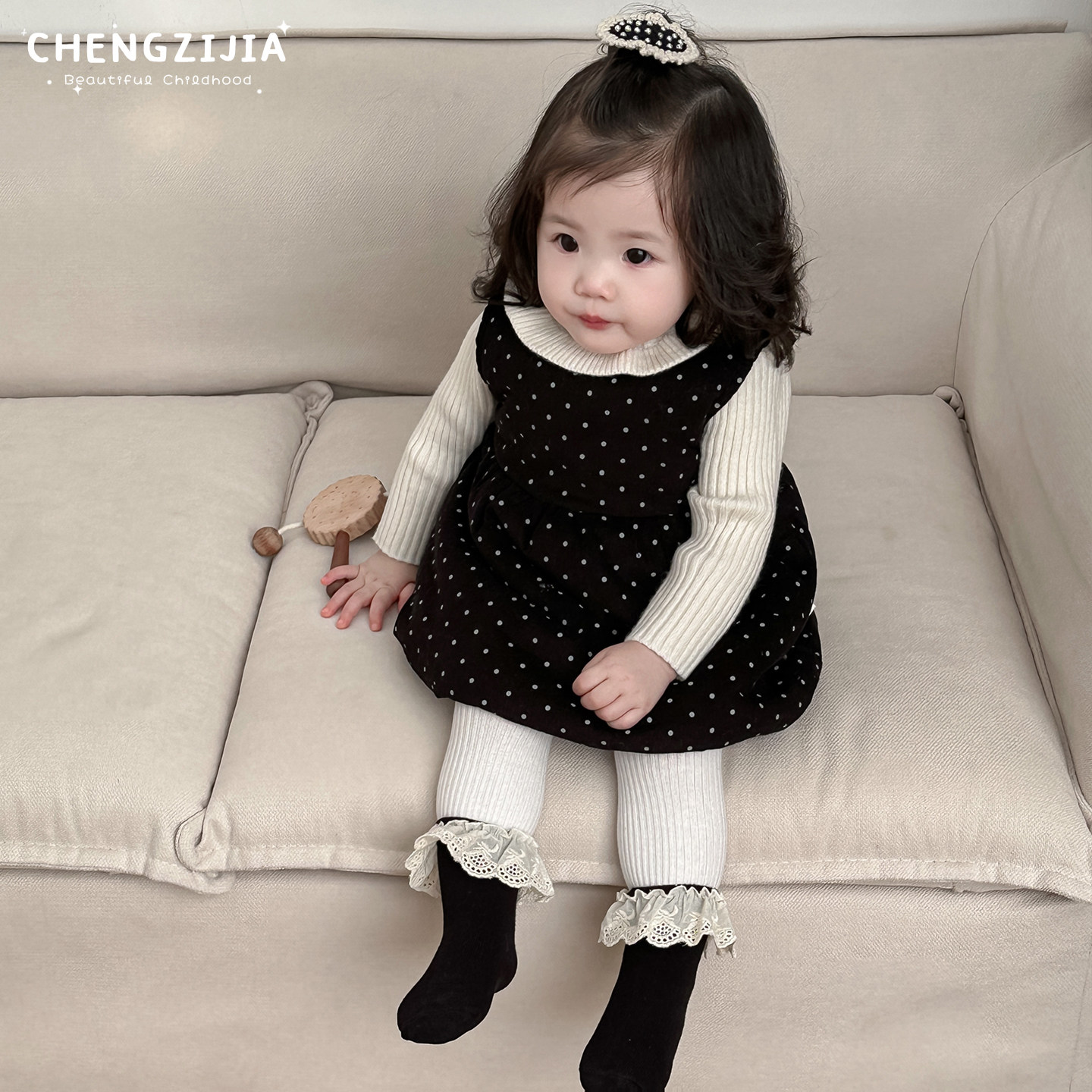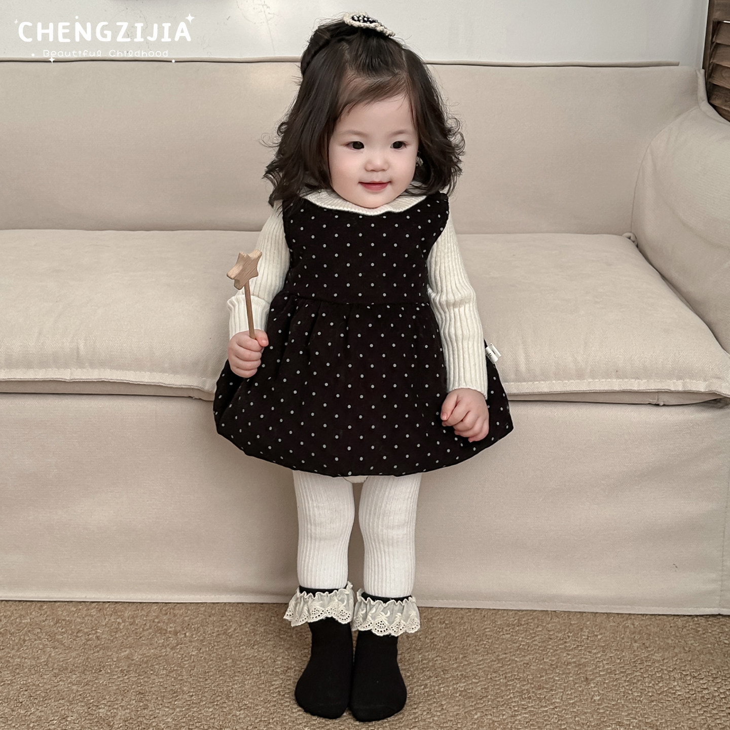 女宝宝秋冬装连衣裙套装婴儿甜美花边领打底衫女童韩版保暖背心裙