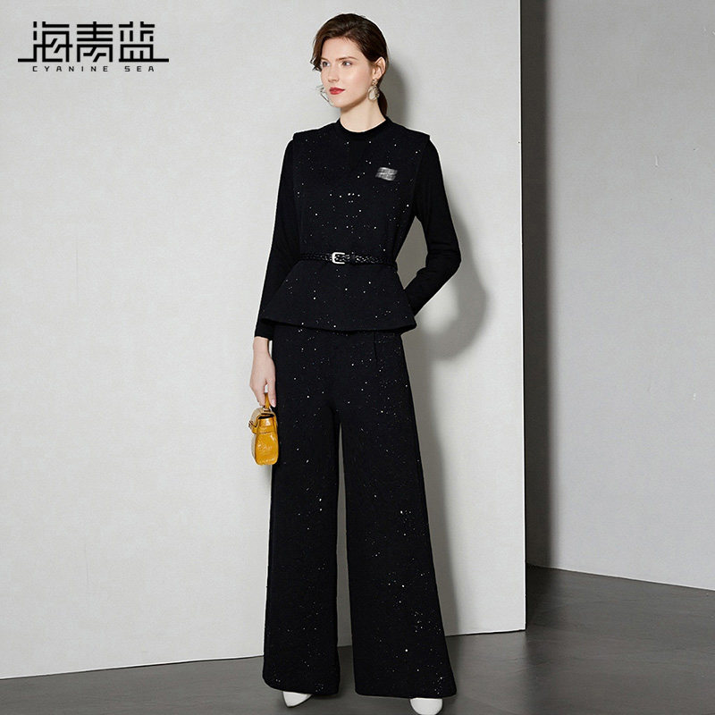 海青蓝 套装女2025新款冬装长袖亮片高级感女装休闲裤丝绒三件套
