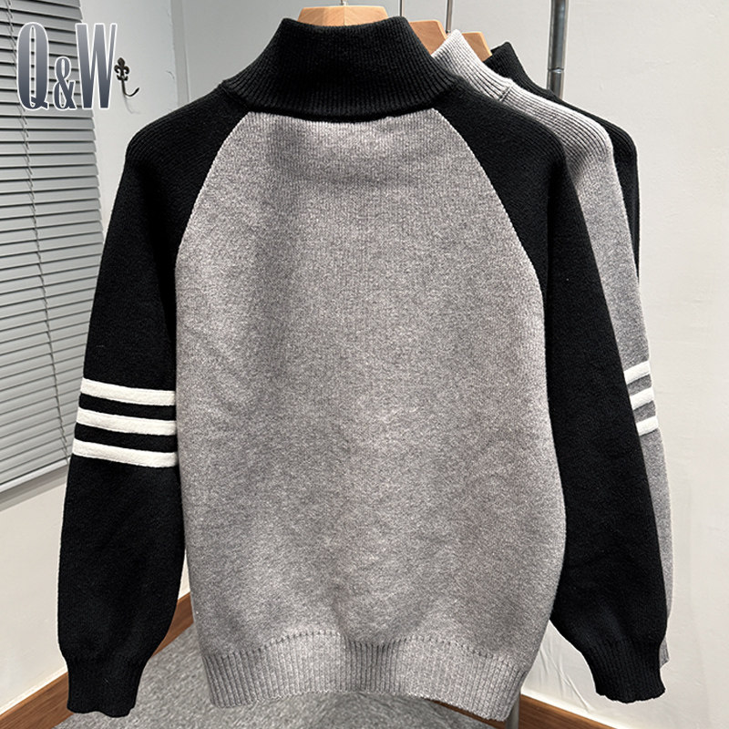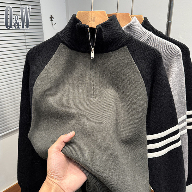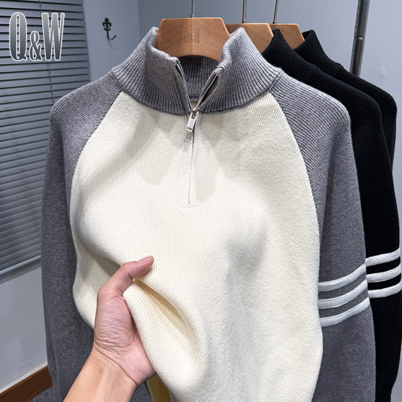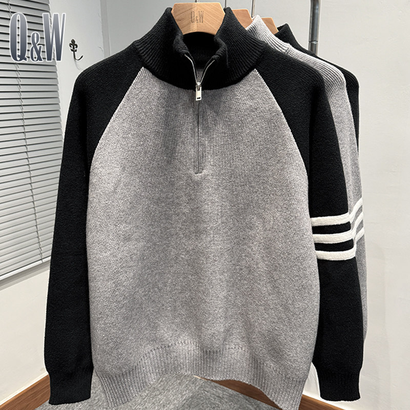 拼色插肩袖拉链半高领毛衣男款冬季韩版宽松tb针织外套运动休闲潮