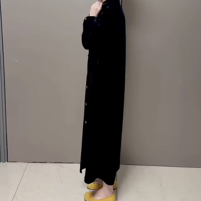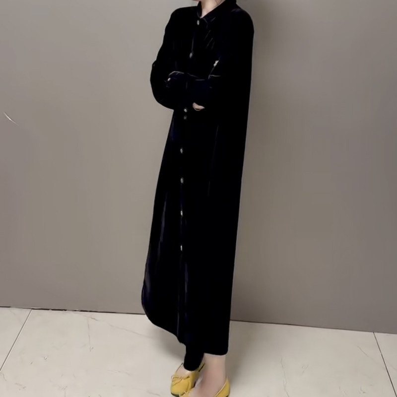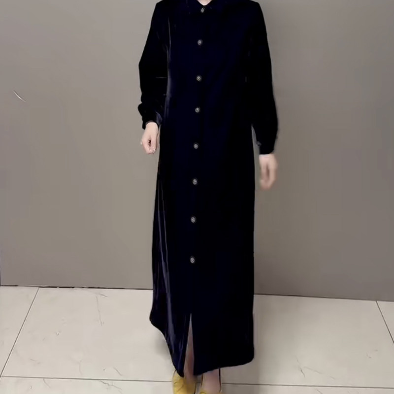 黑色成熟气质欧货秋新款时尚丝绒长袖宽松高级感A字中长款连衣裙