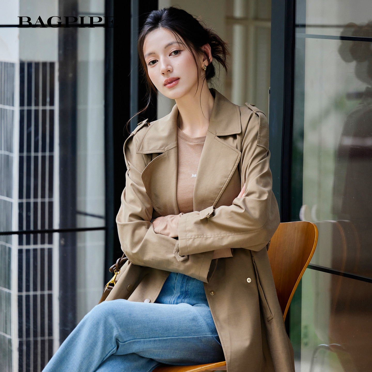 风笛2026春季新款韩系简约西装领风衣外套女气质通勤中长款外衣