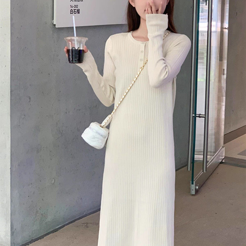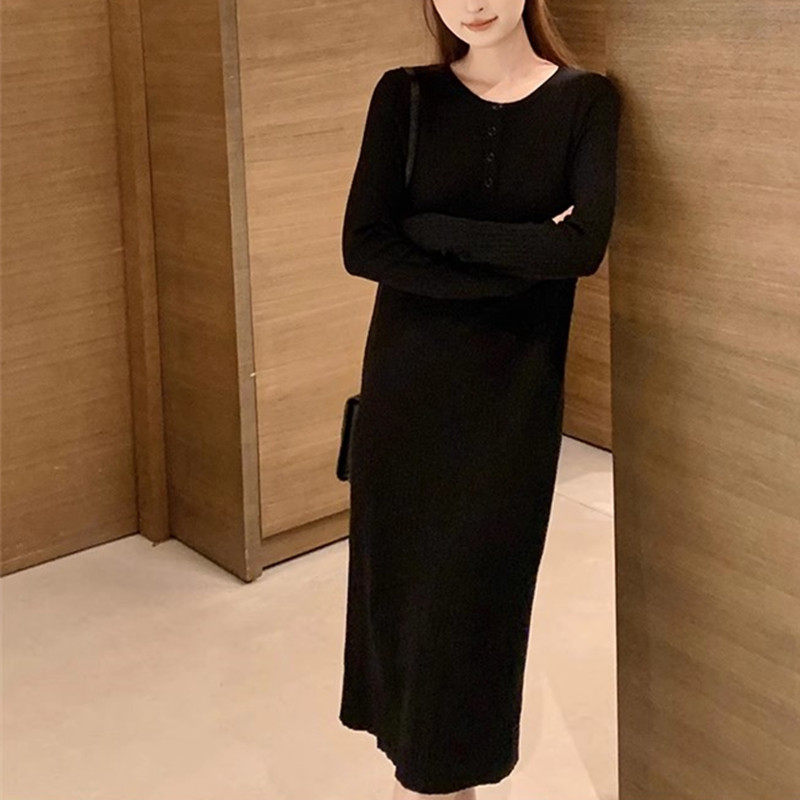 春秋新款小个子黑色针织连衣裙子女秋冬季搭配大衣显瘦打底裙长裙