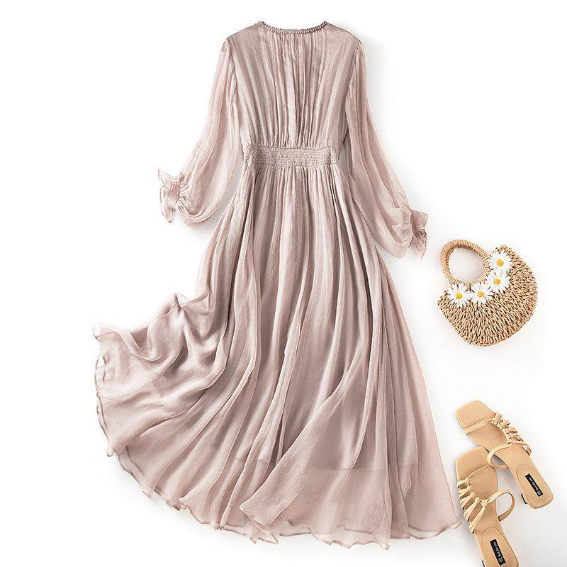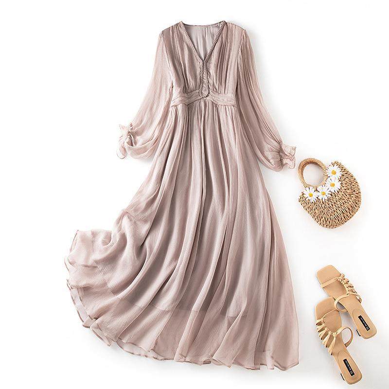 芭碧尔女装真丝连衣裙长袖春夏季新款乔其纱仙女连衣裙85044