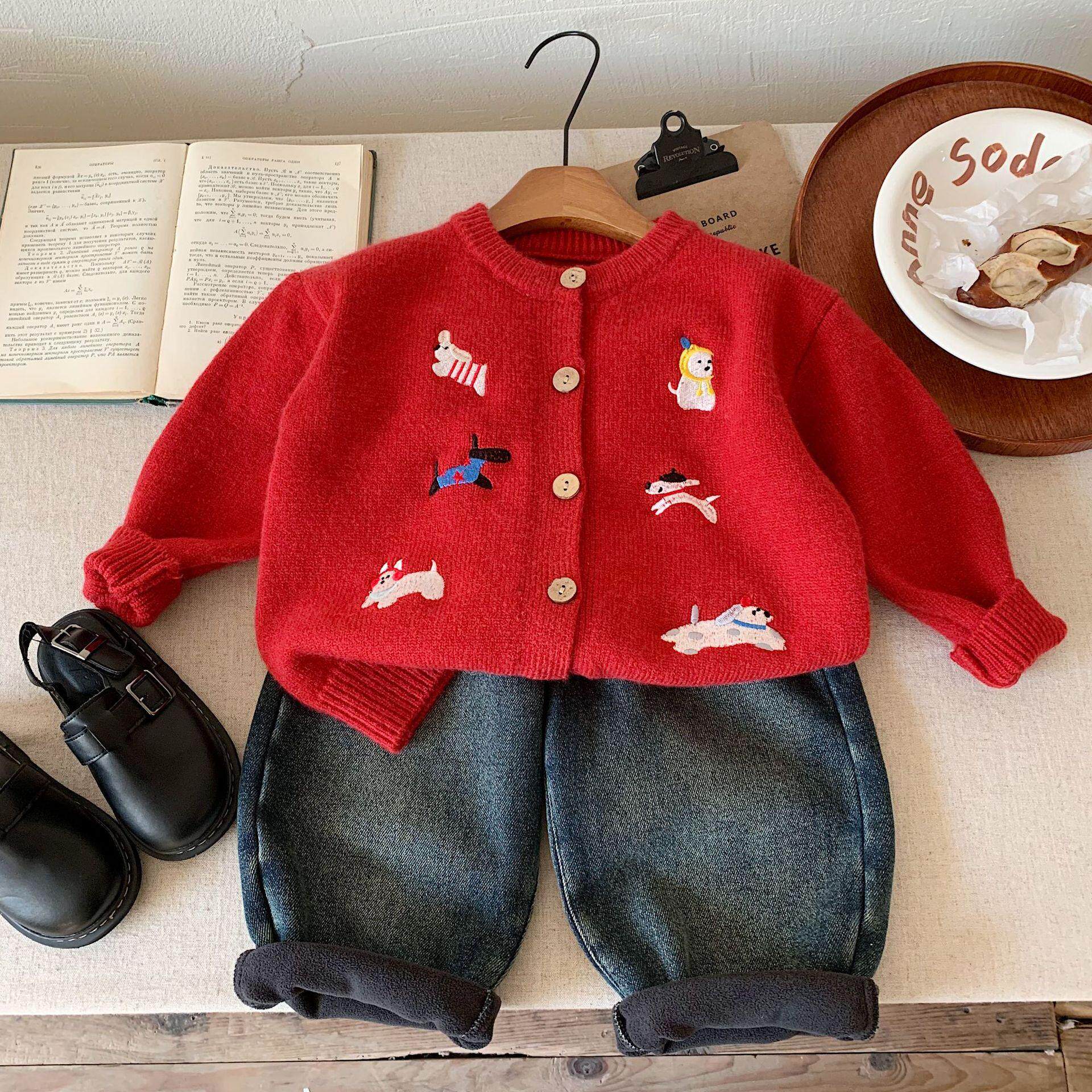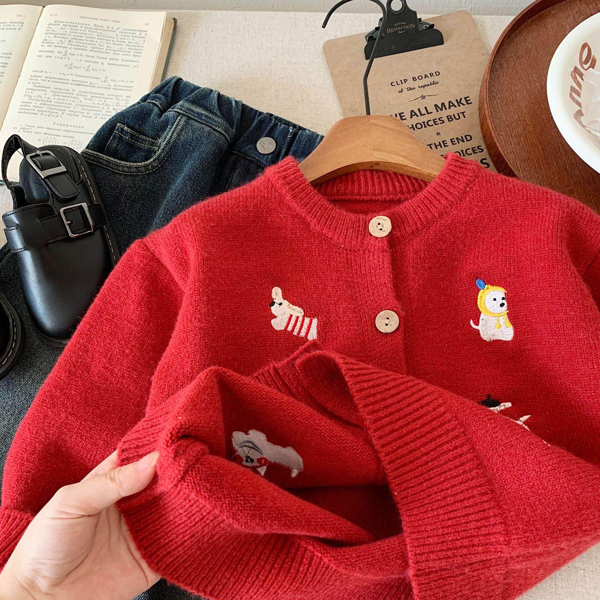 儿童红色毛衣冬季款男童喜庆上衣小童拜年衣服宝宝过年开衫女加厚