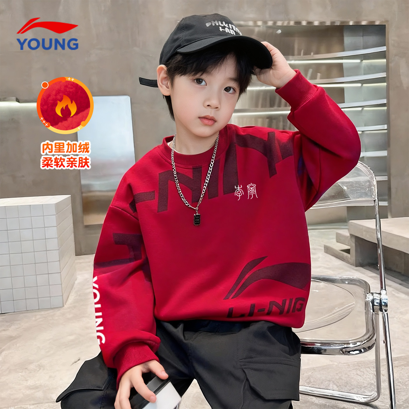 李宁男童卫衣冬季加绒新款红色马年新年服正品大童青少年加厚童装