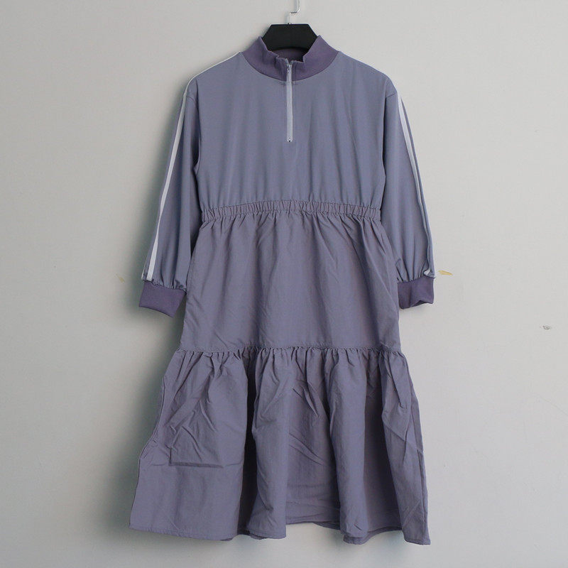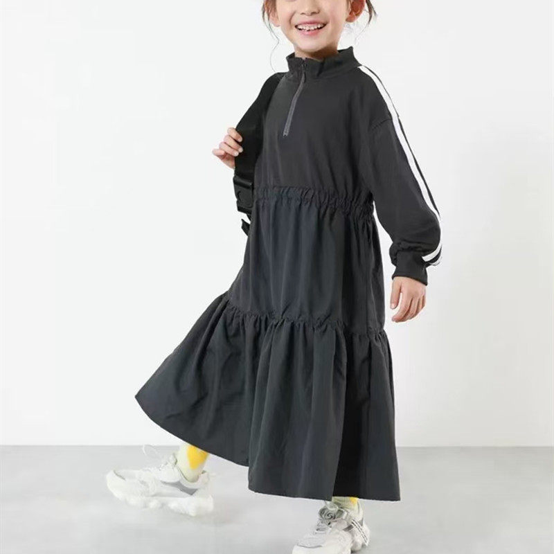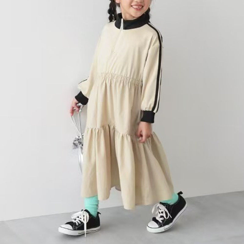 日系中大童女童半拉链洋气百褶长袖连衣裙春夏松紧收腰女裙可亲子