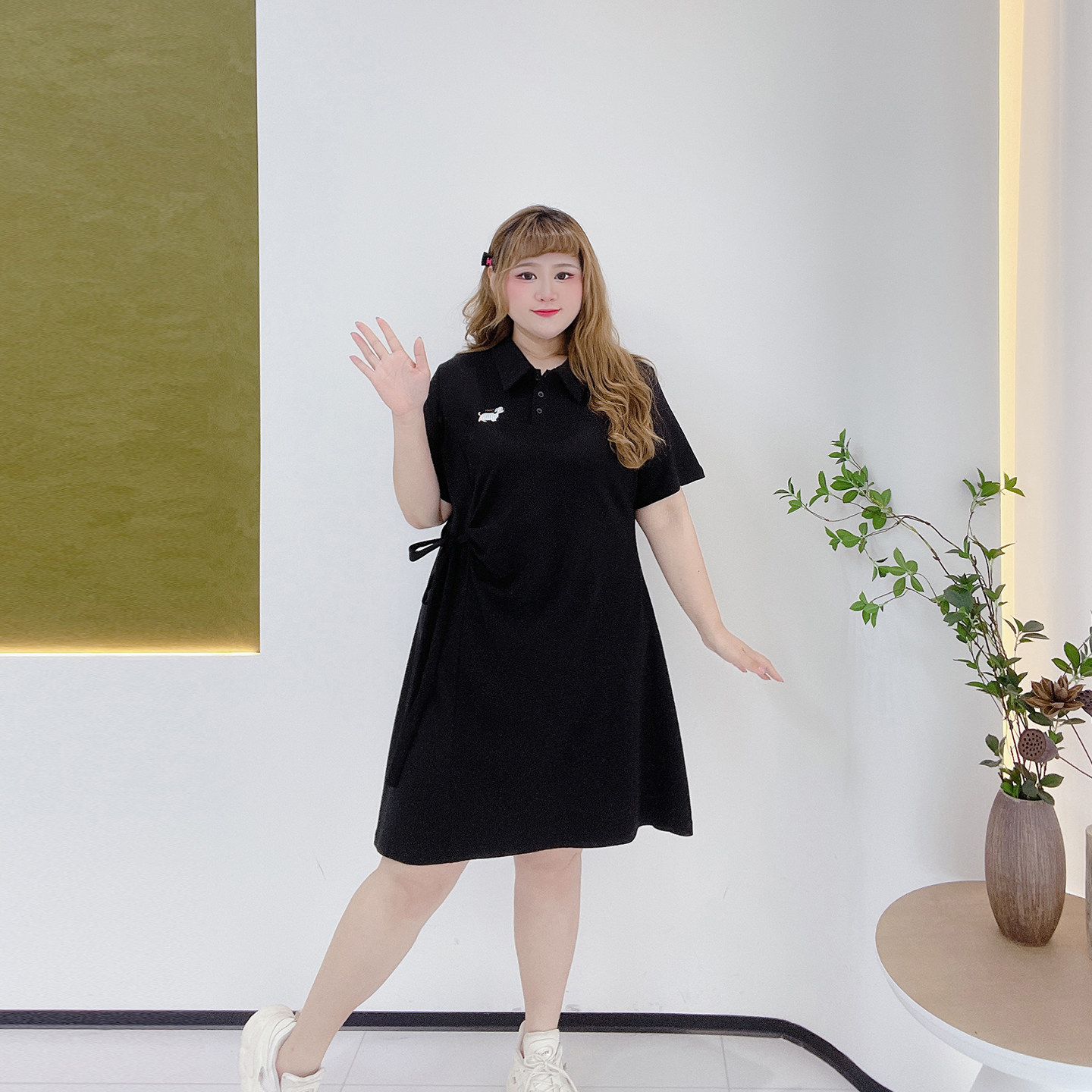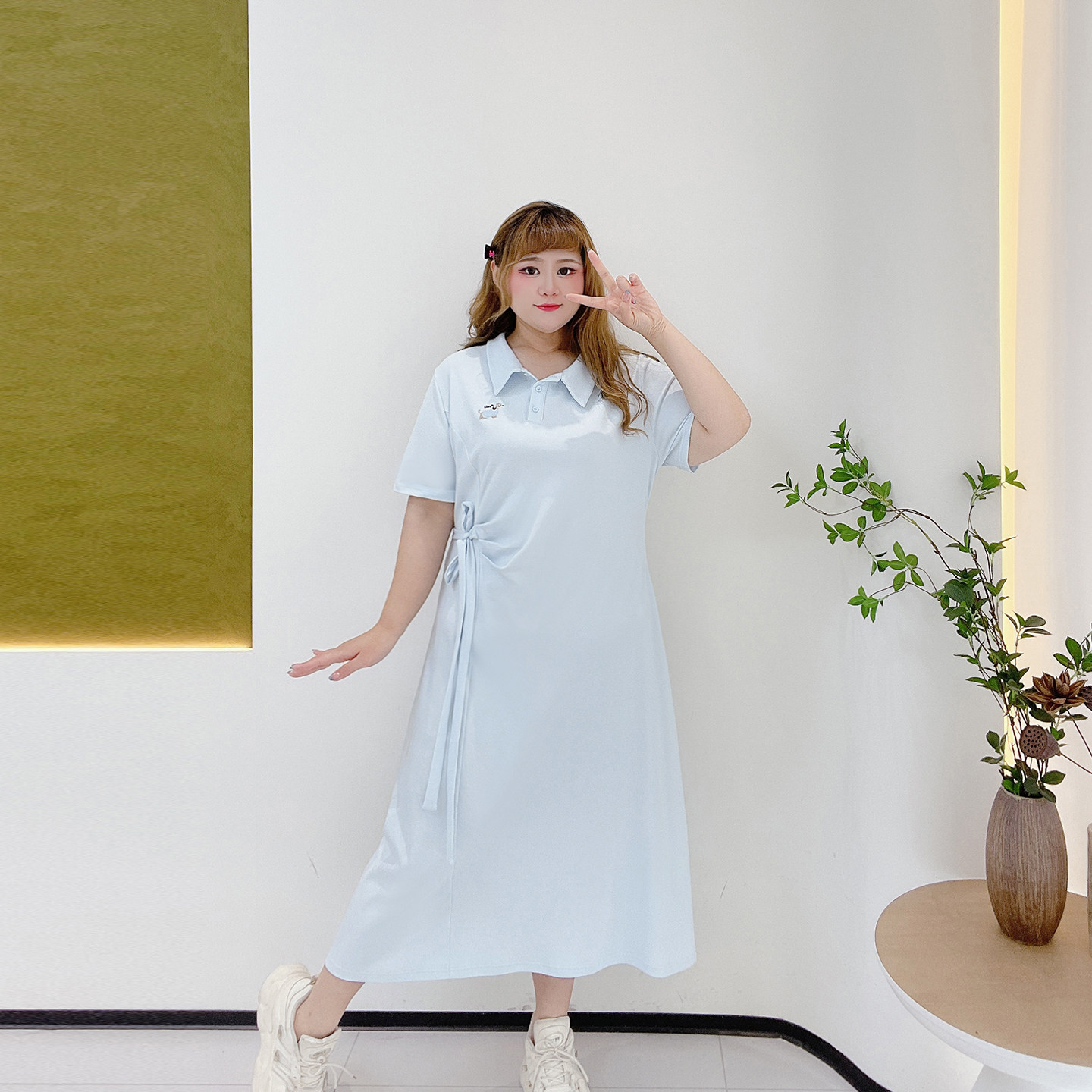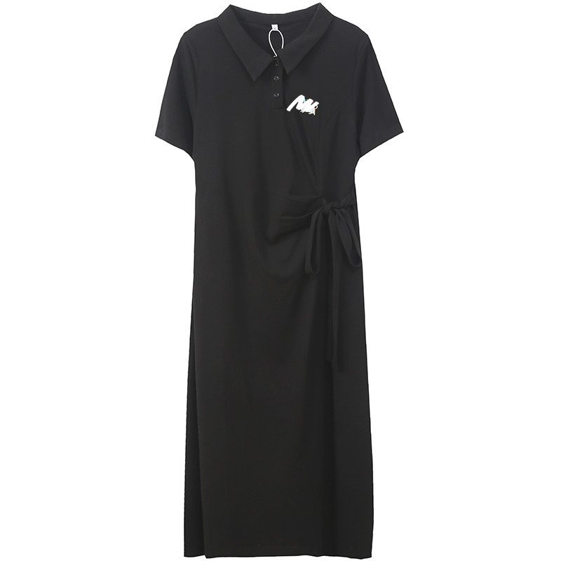 学院刺绣长短款胖莹莹大码女装夏季休闲polo领扭结显瘦衬衫连衣裙