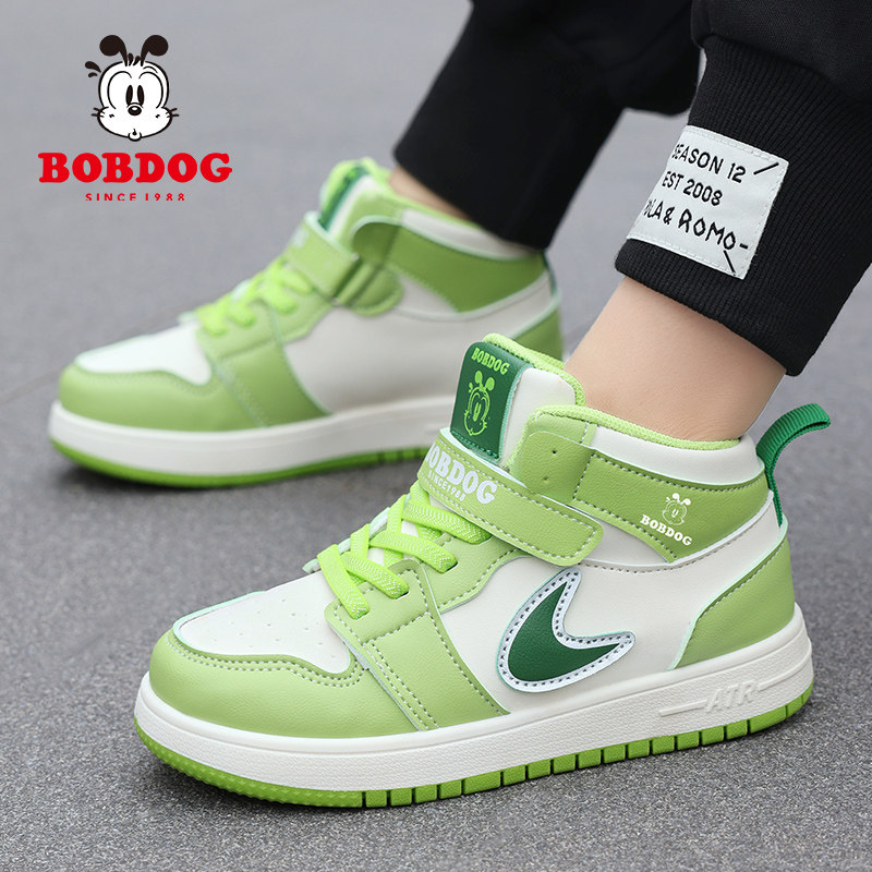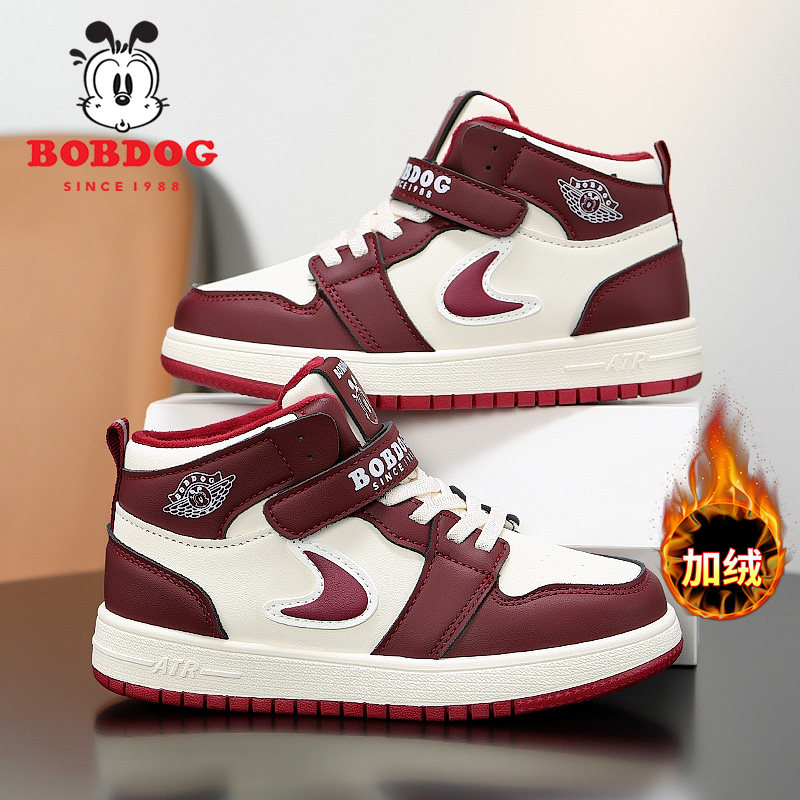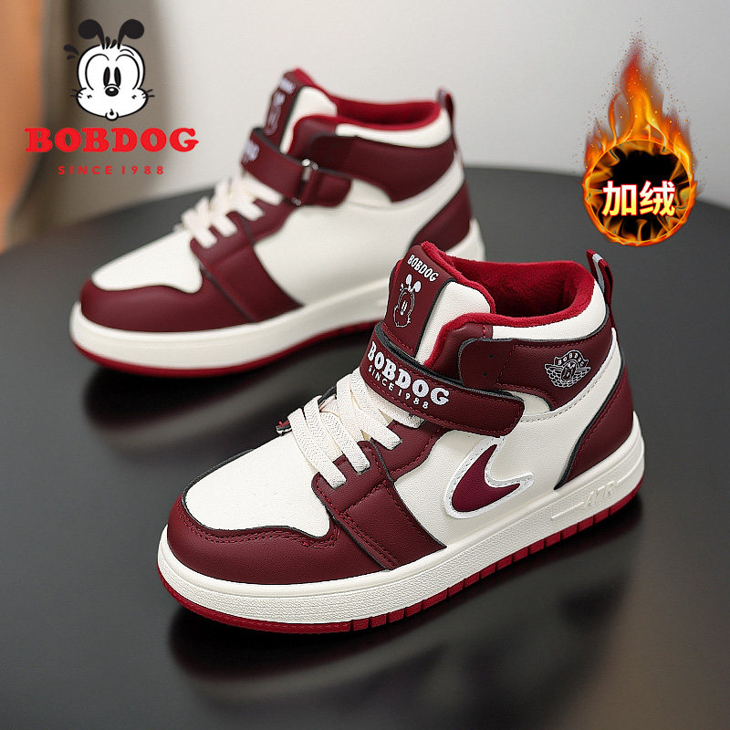巴布豆童鞋女童男童红色过年加绒二棉高帮板鞋皮面防水儿童运动鞋