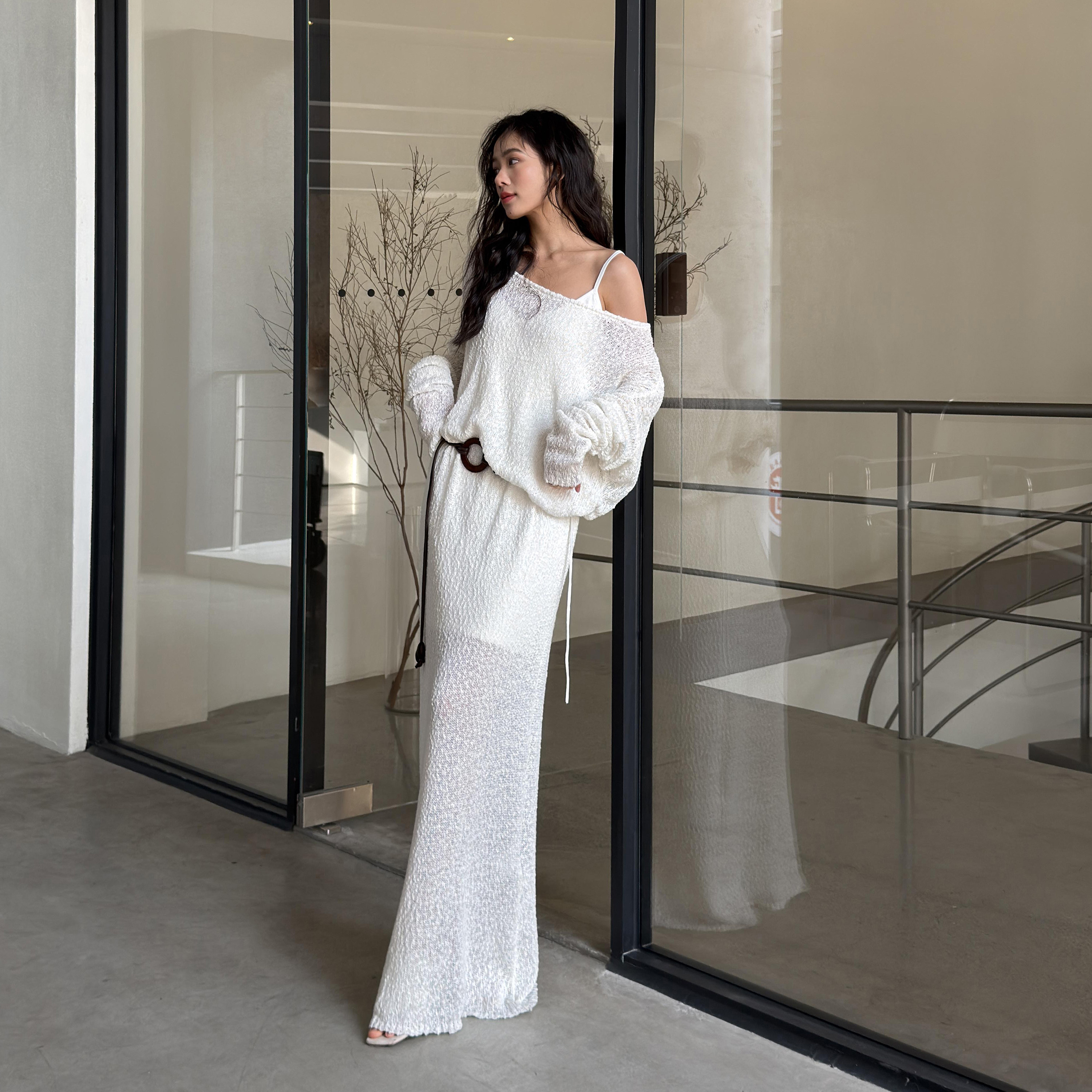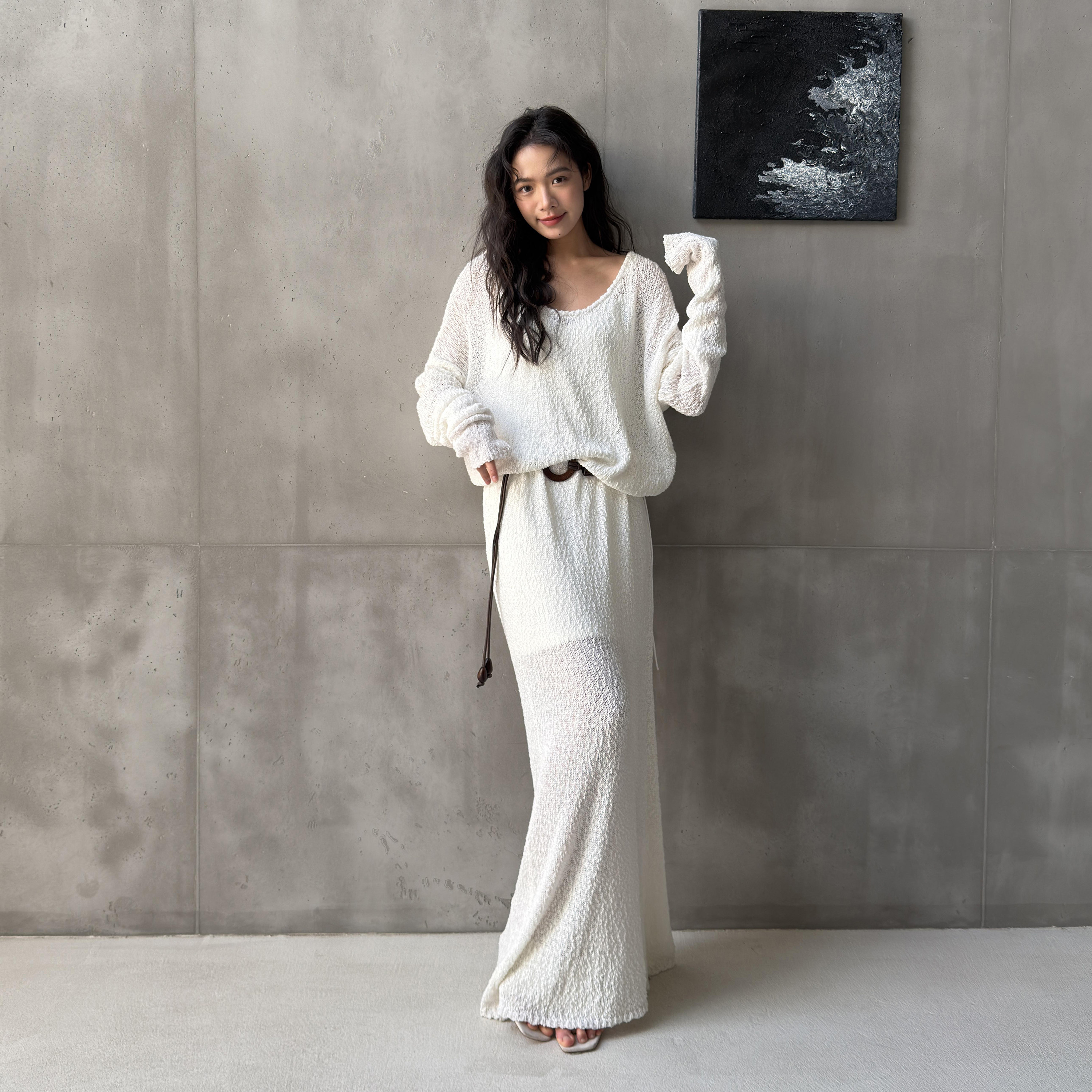 LEDIM WANG 松弛感H型长袖连衣裙女白色透视宽松长裙2026春季新款