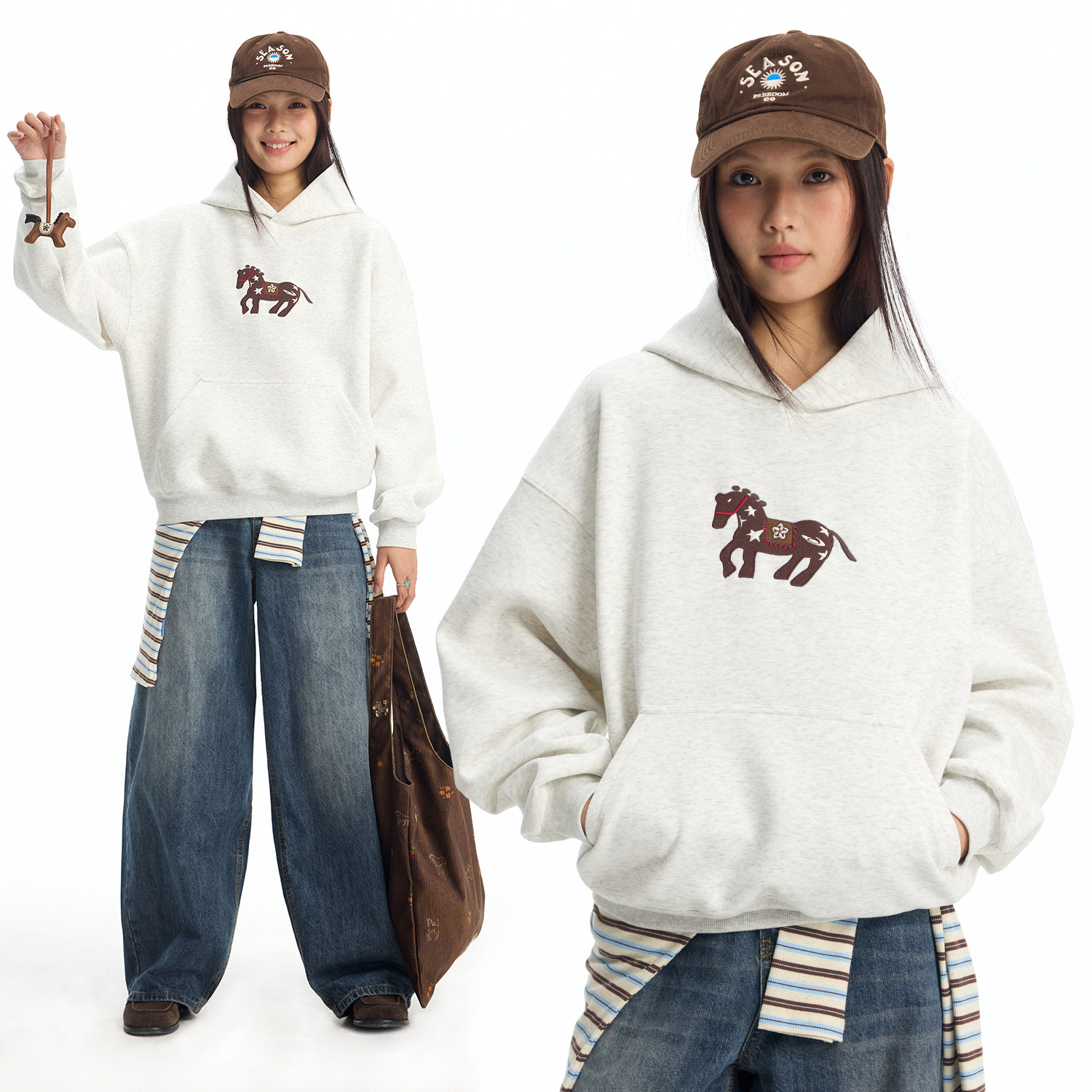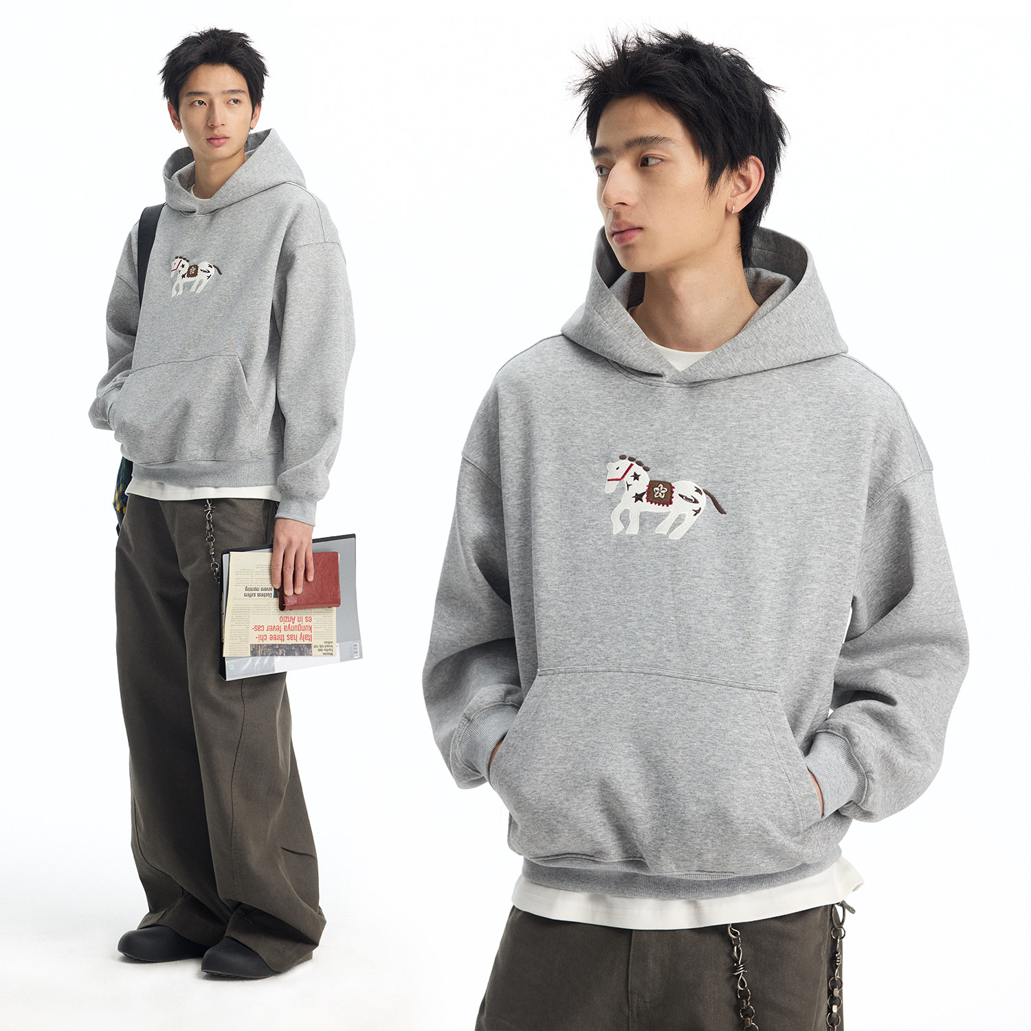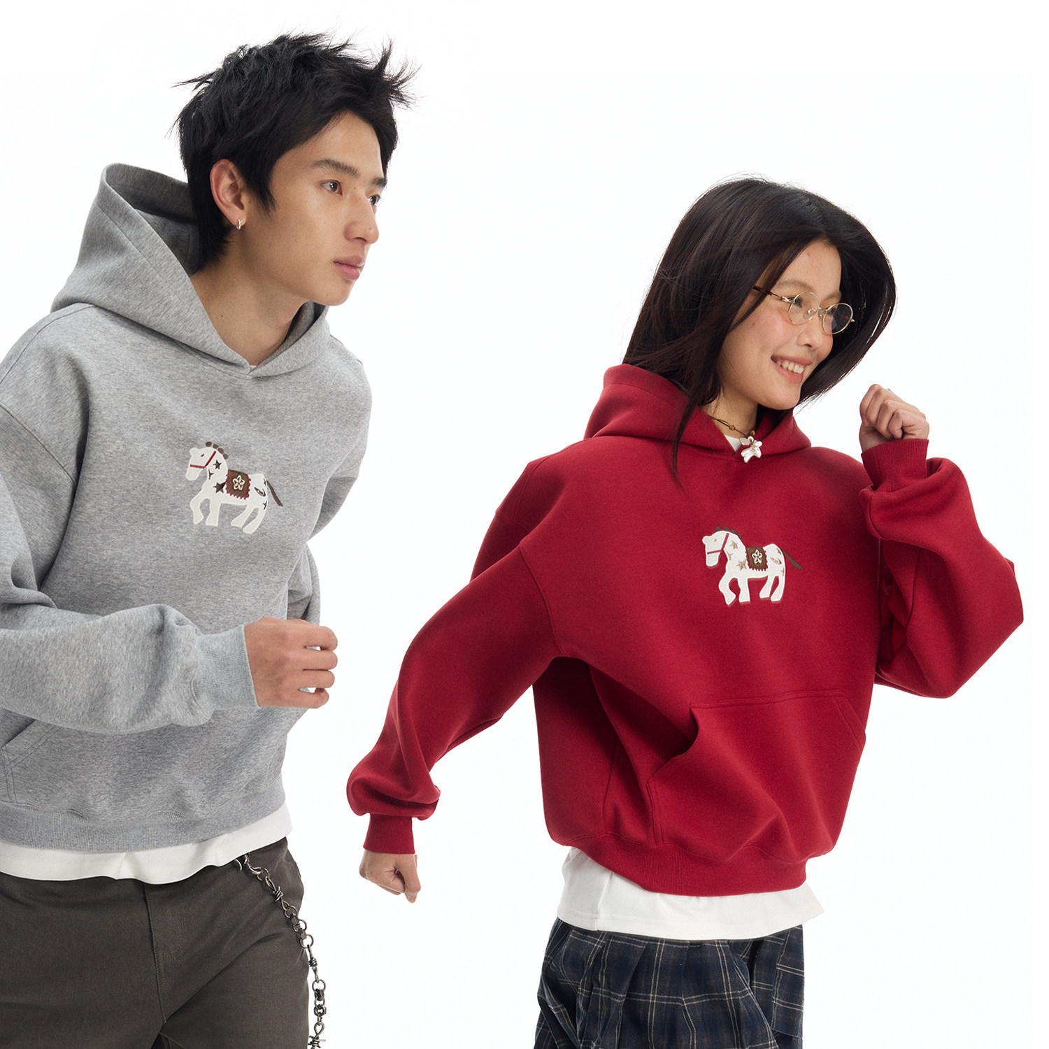 江南先生NewJNXS新年红色小马刺绣连帽卫衣春落肩宽松上衣男女款