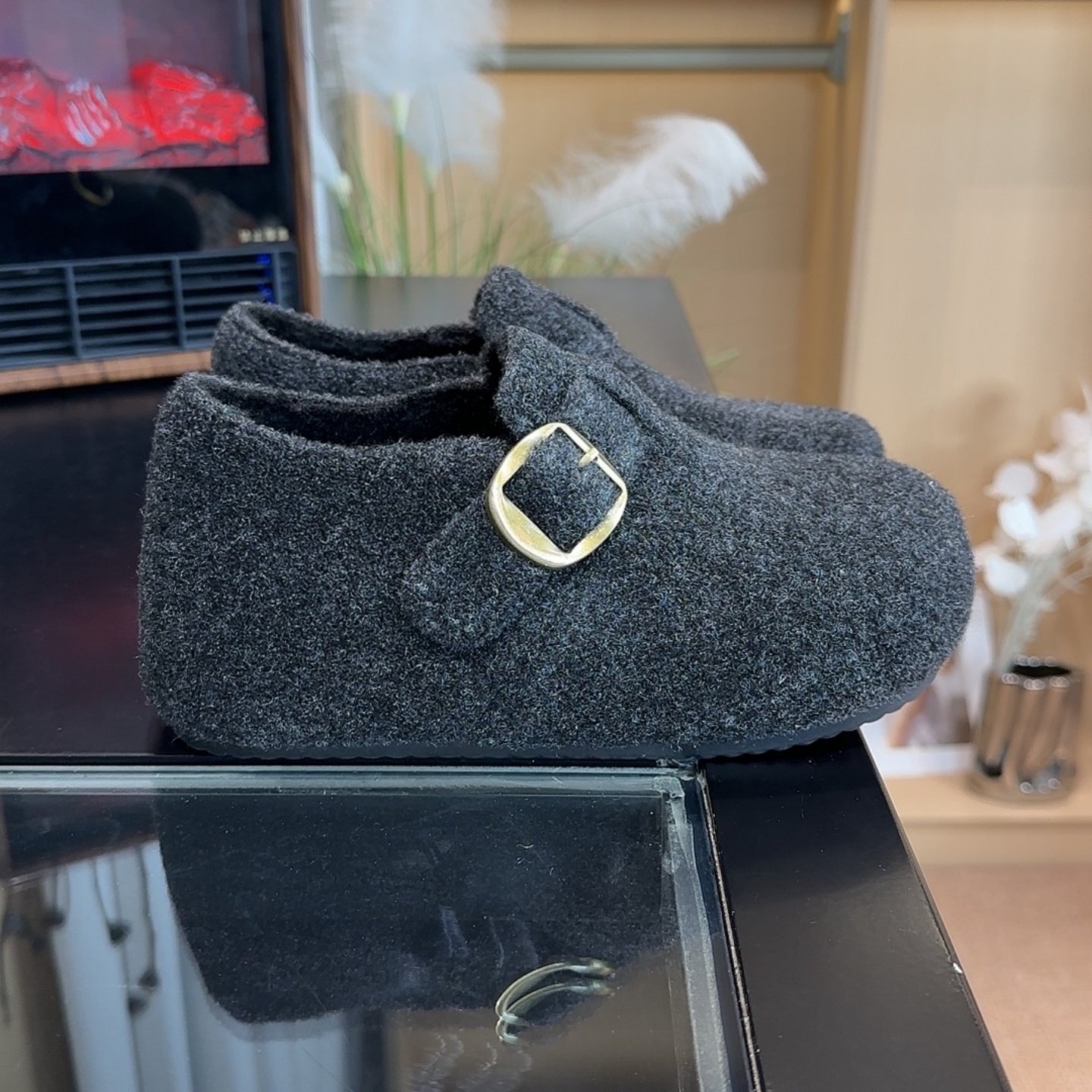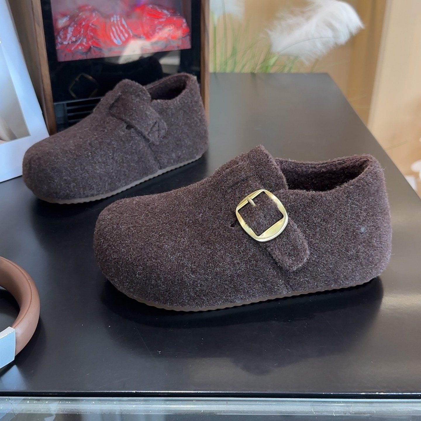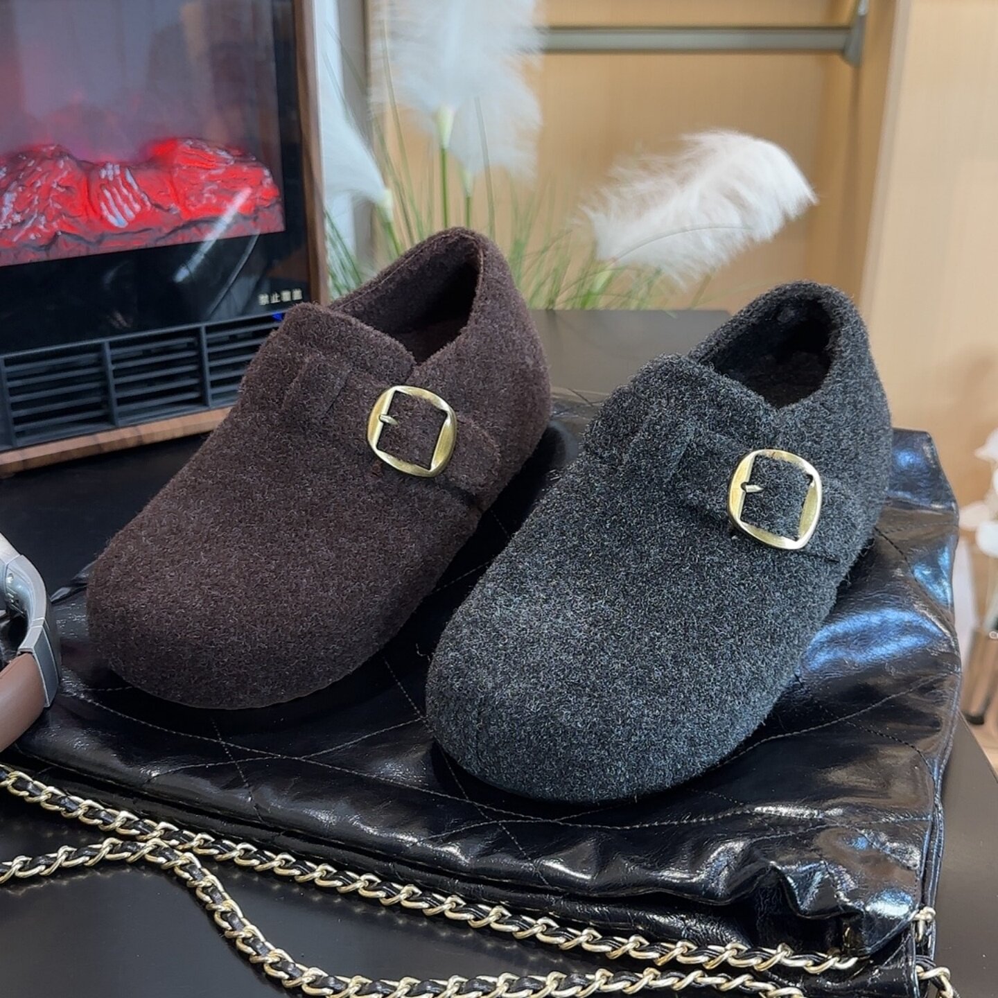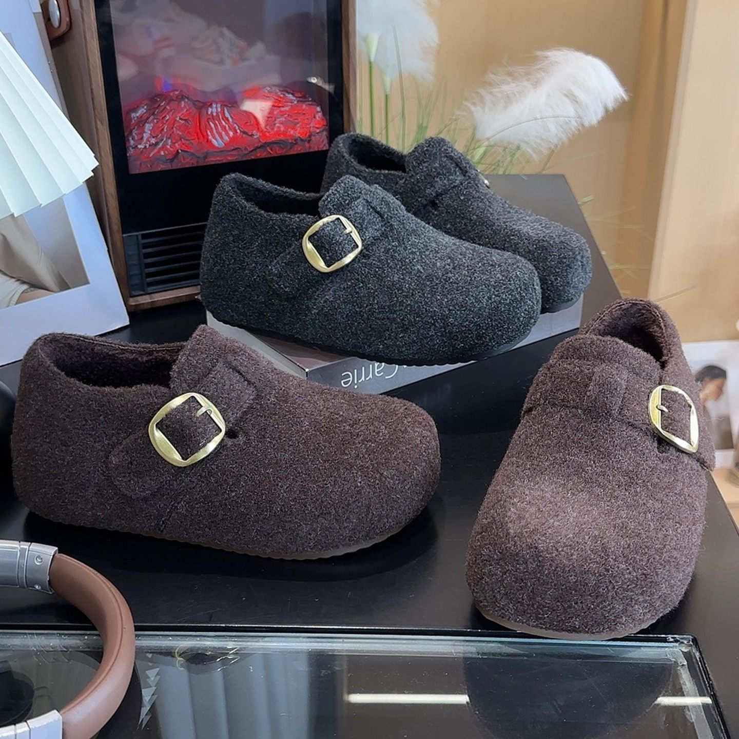 内增高厚底毛呢勃肯鞋女鞋加绒加厚2025冬季新款灰色毛绒勃肯棉鞋