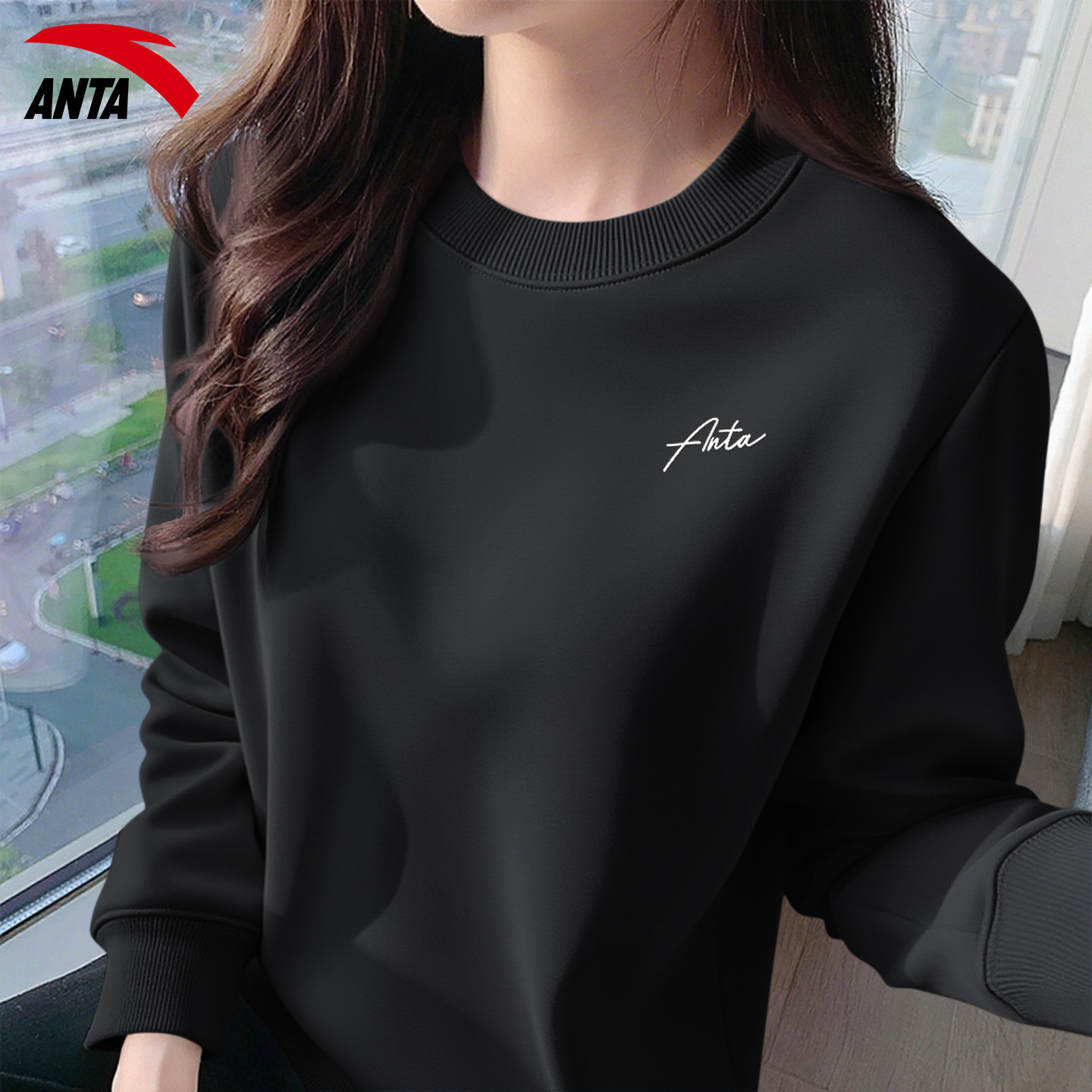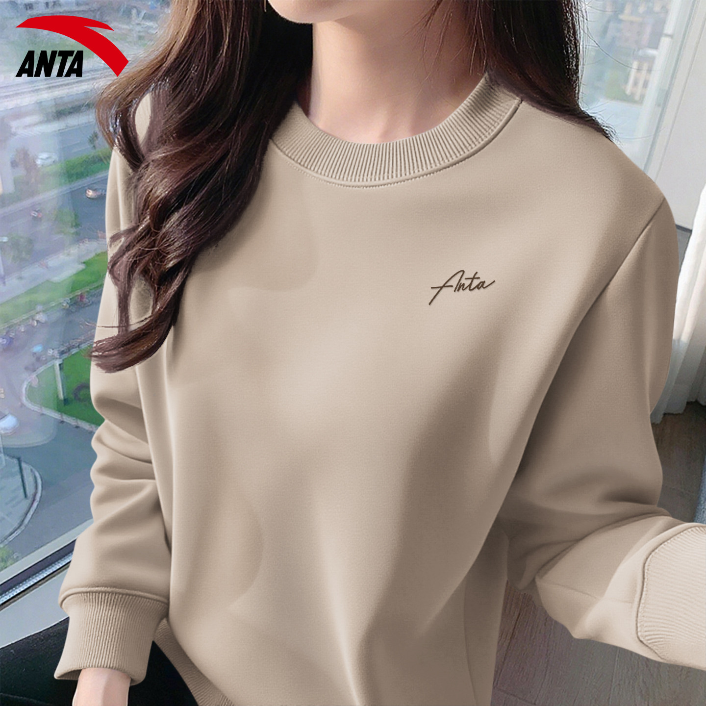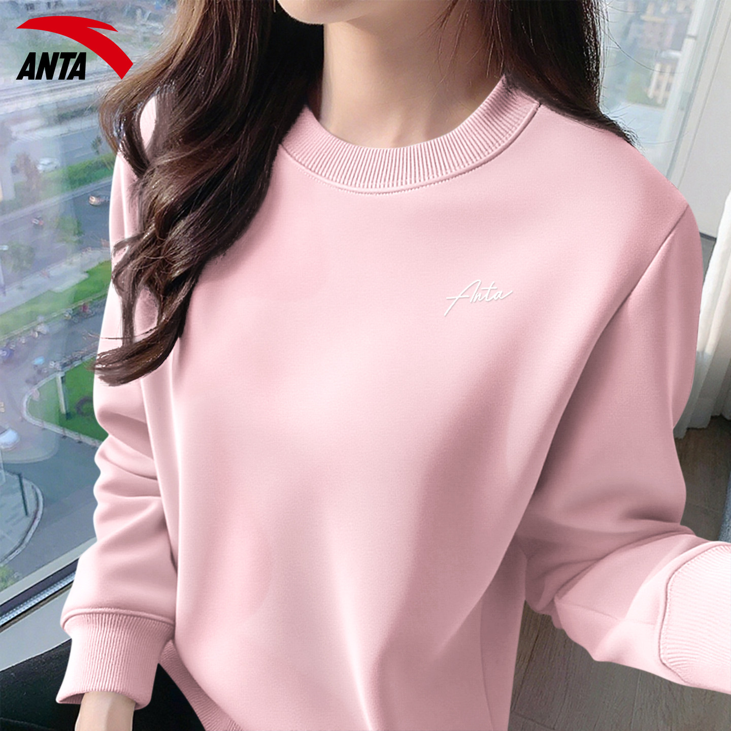 安踏卫衣女秋季新款长袖圆领运动甜美休闲针织紫色女子保暖套头衫