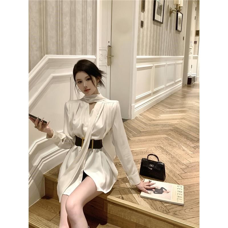 白色缎面衬衫连衣裙女秋季高级感长袖裙子御姐风气质收腰a字短裙