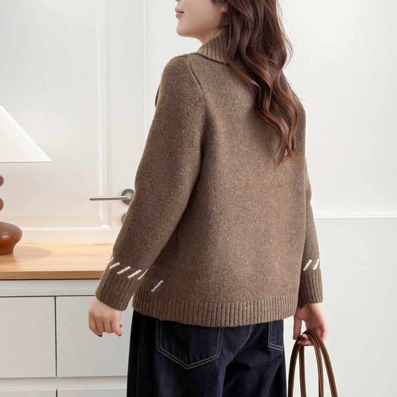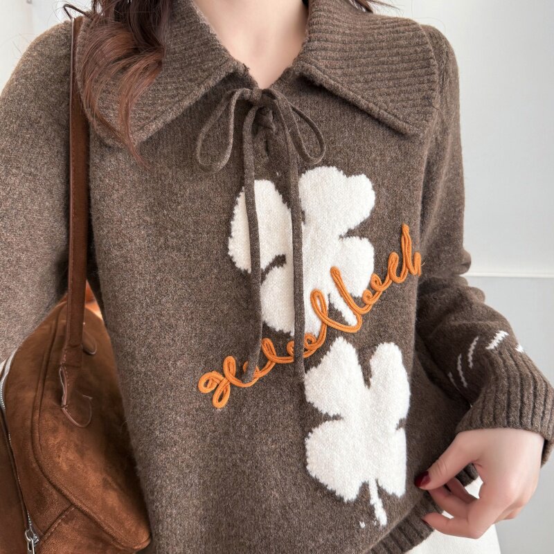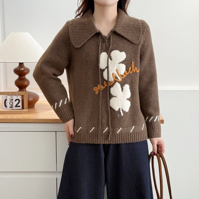 大码冬装新款可爱休闲风翻领系带提花毛衣女宽松慵懒针织衫上衣