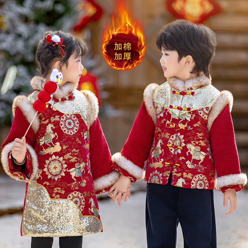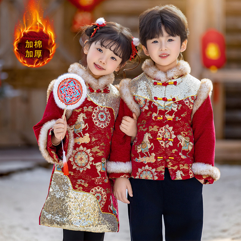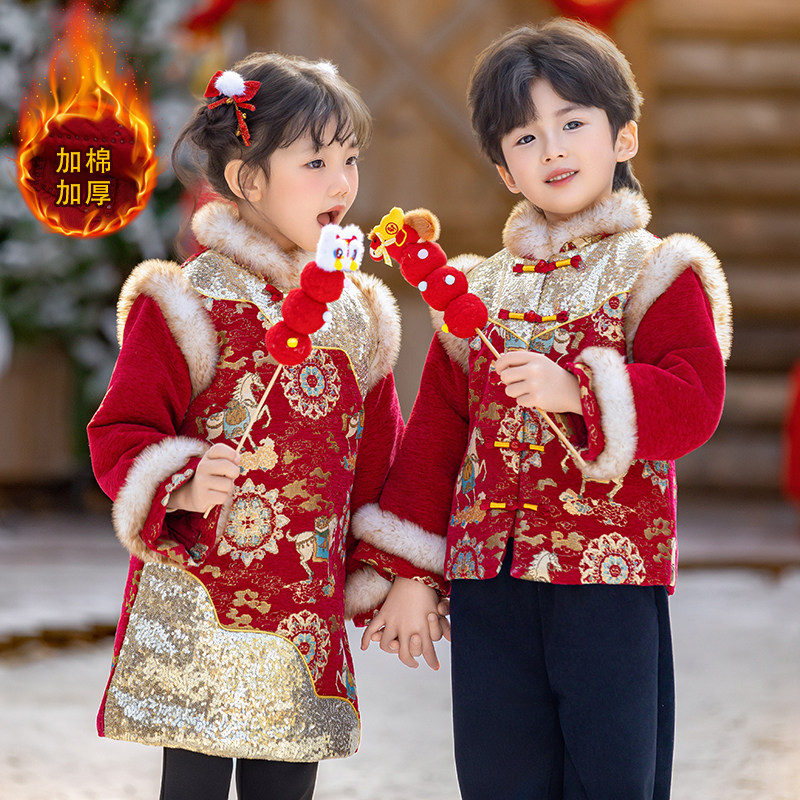 女童旗袍裙男童新中式套装2025年新款唐装儿童国风拜年服加棉加厚