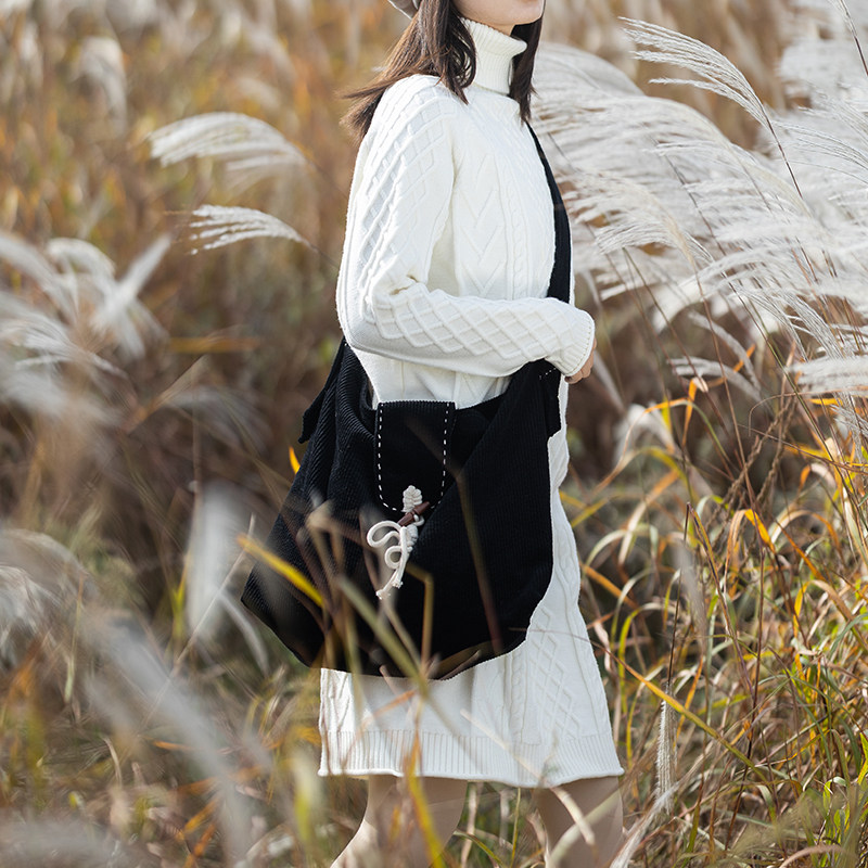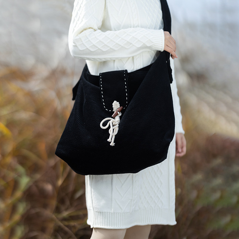 【休闲态度】百搭黑色休闲斜挎包女款2025冬季灯芯绒大容量单肩包