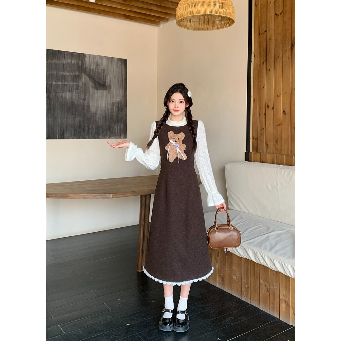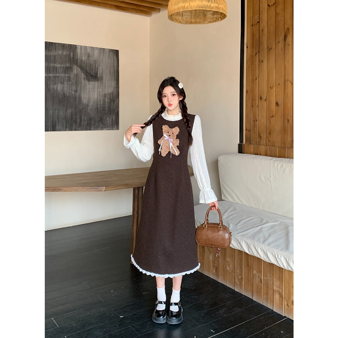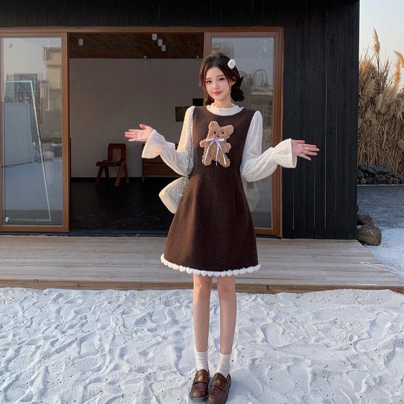 微胖2025冬装新款胖mm大码女韩系甜美假两件卡通小熊长短款连衣裙