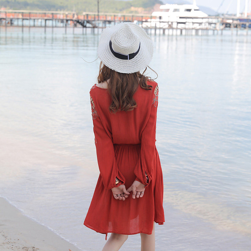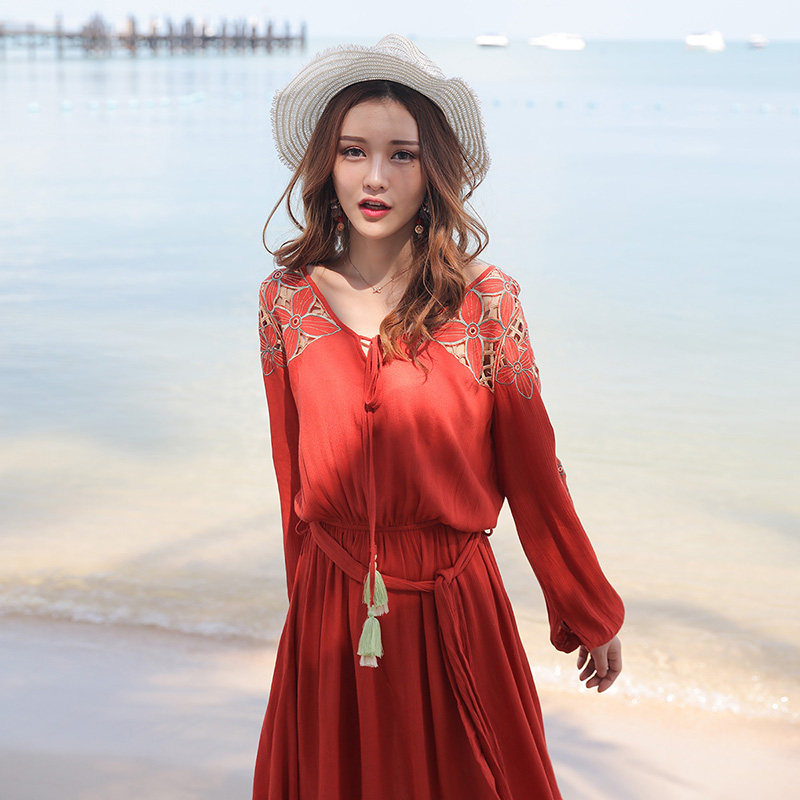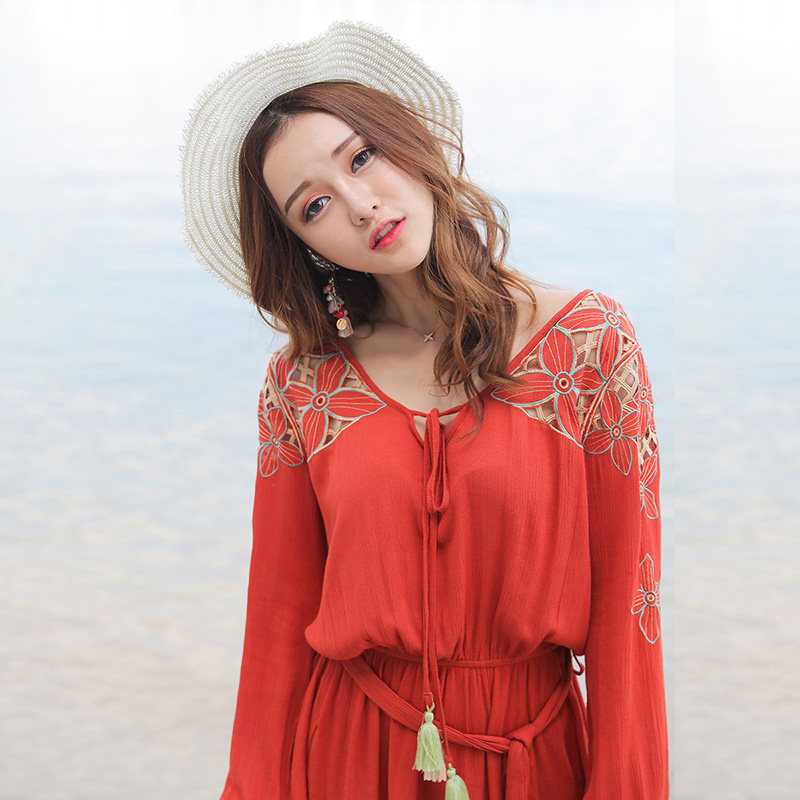 夏刺绣镂空流苏优雅淑女民族风云南海南度假防晒长袖短裙连衣裙