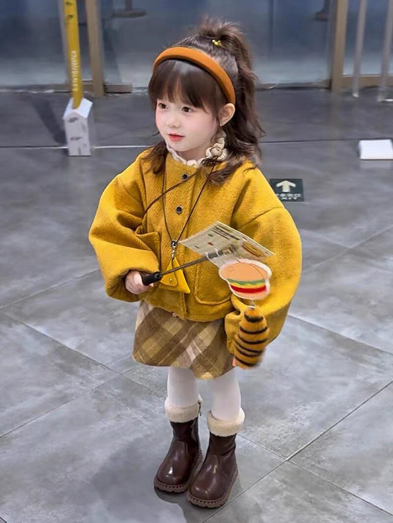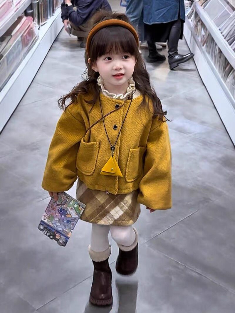 原创设计2026冬季新款洋气女童小香风加绒开衫外套格子半身裙套装
